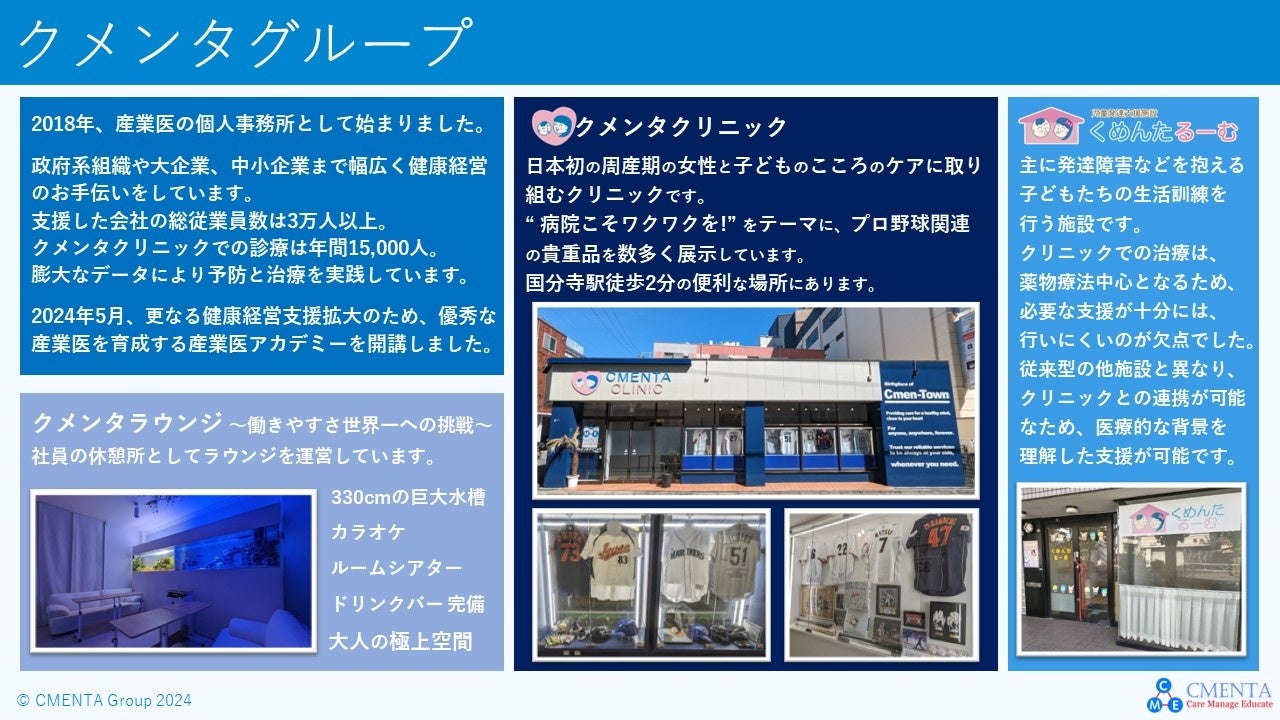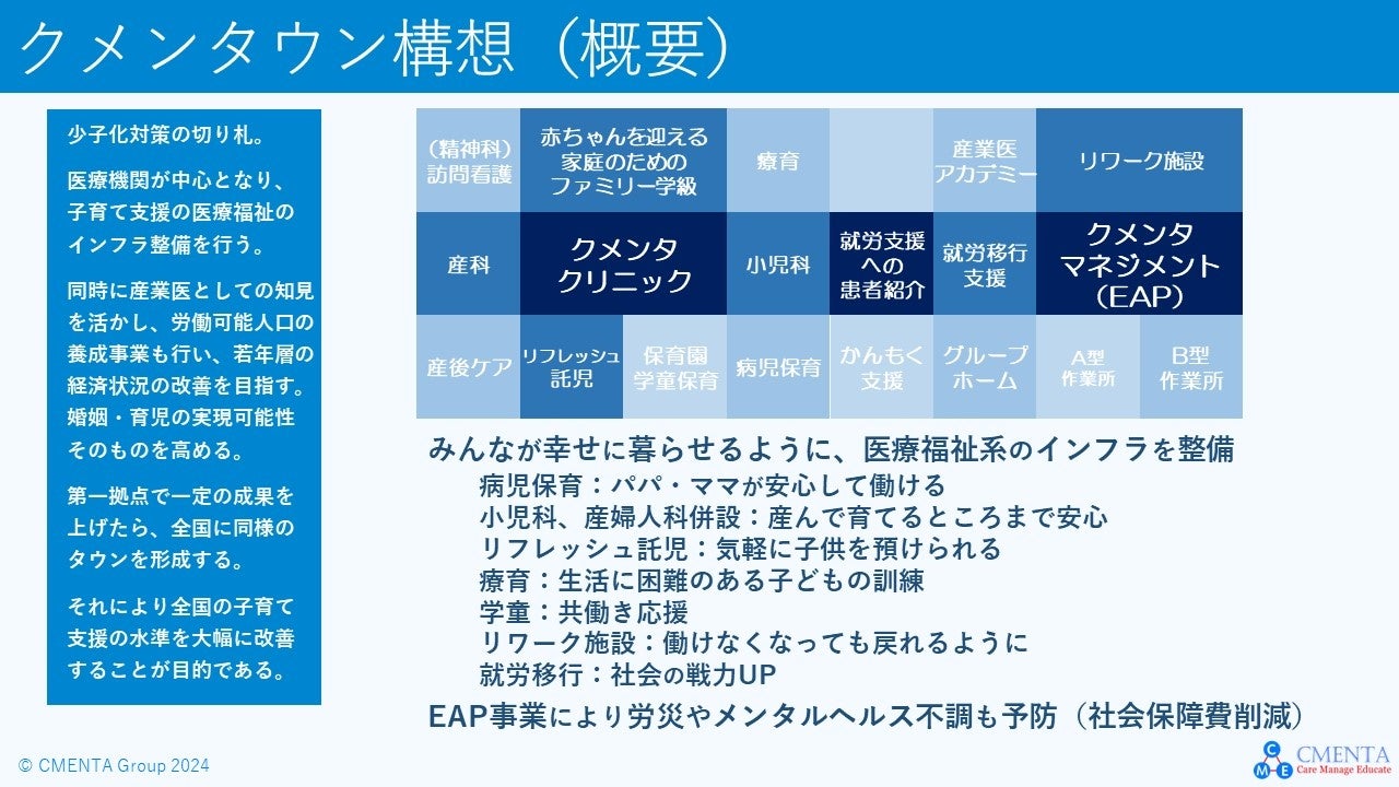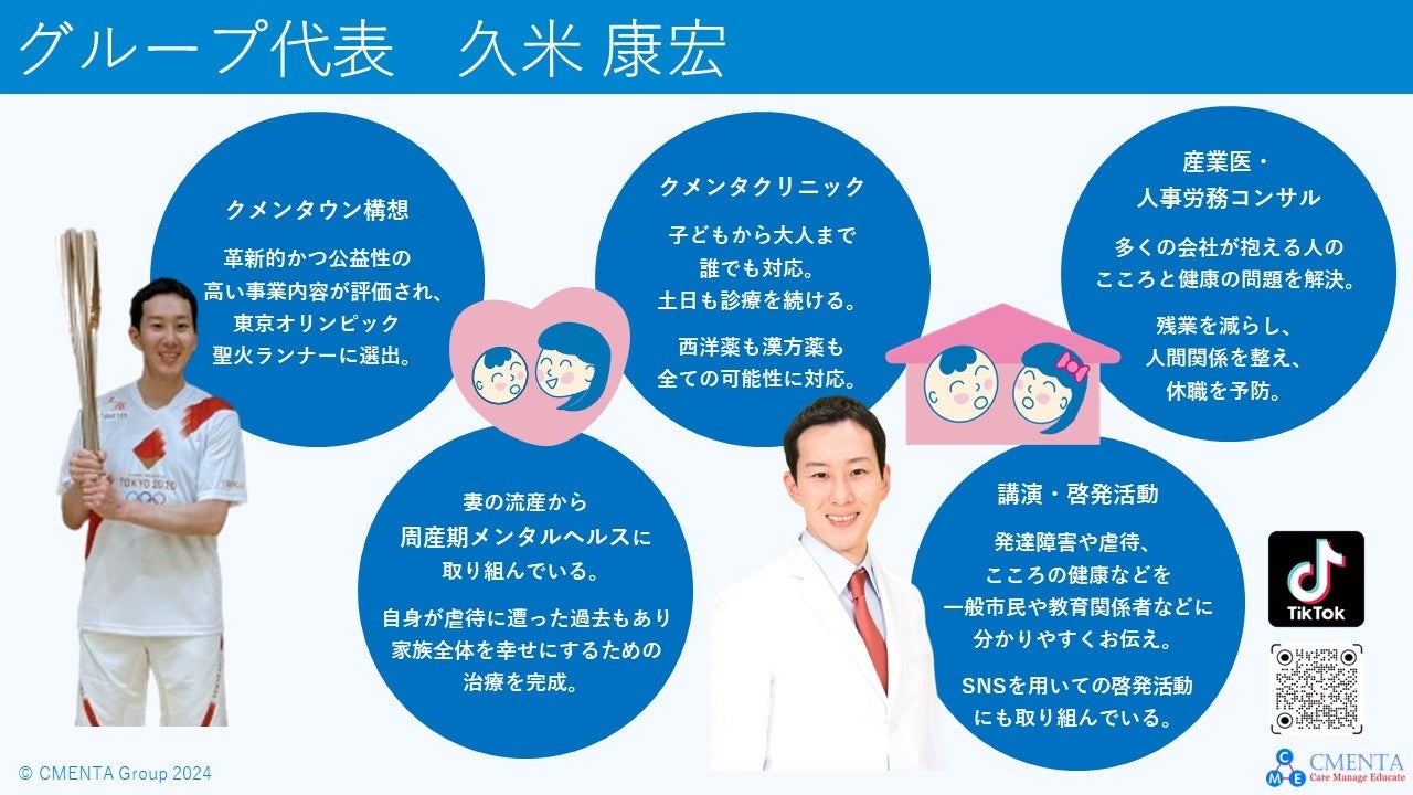 株式会社クメンタは創業者である久米康宏の産業医の個人事務所として創立し、グループ代表がこれまで企業様と築いてきたノウハウと、自身の専門知識、またそれを継承する産業医により、企業の競争力向上のための従業員への健康支援を行っております。子育て支援のための医療福祉のインフラ整備を行うことが、私たちクメンタグループの目指すクメンタウン構想の全てであり、当ストーリーでは構想実現への思いやその背景についてご紹介いたします。