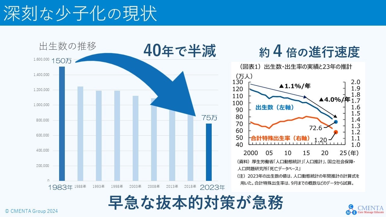 以前から懸念されていた少子化ですが、急速に進行しています。40年前と比べて、ついに昨年、生まれた子どもの数は半分になってしまいました。