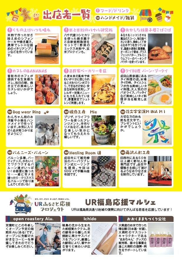 近隣のベーカリーや焼き菓子店、雑貨店などを集めたマルシェに加え、「UR福島応援マルシェ」を初開催。UR都市機構が浜通り地域の復興に向けてがんばる若者を応援する取り組みで、福島からこだわりのコーヒーやお酒をご用意してお待ちしております。