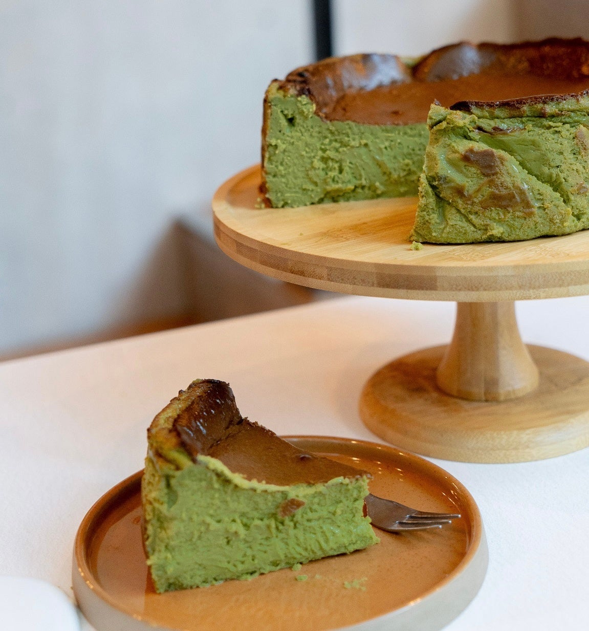 抹茶のバスクチーズケーキは、京都の宇治抹茶を100%使用し、ぎりぎりの焼き加減に調整することで滑らかでとろけるような口溶けが特徴です。食べる箇所によって半生食感からベイクドの食感まで様々な食感をお楽しみいただけます。