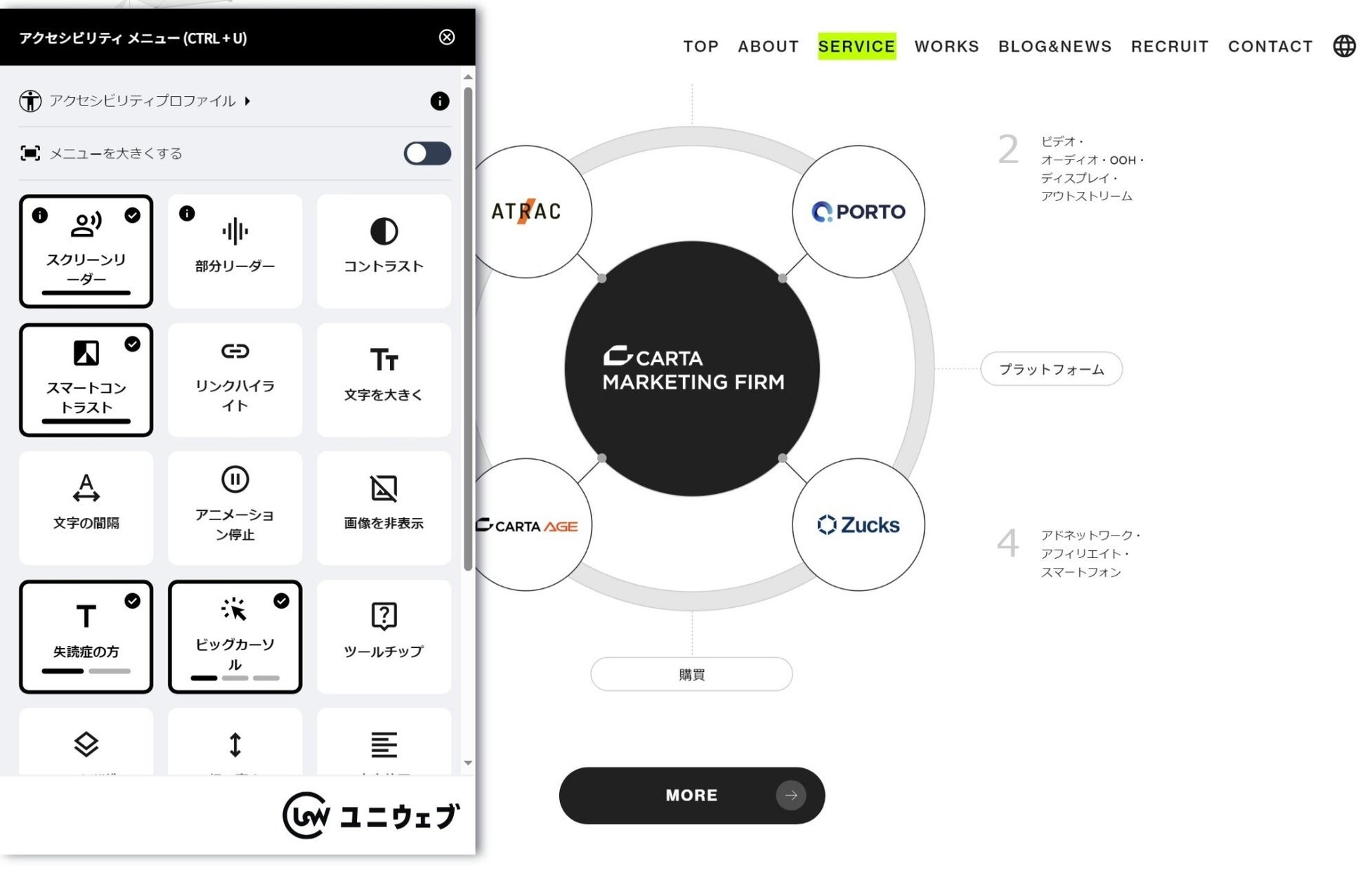 画面左下にユニウェブのアイコンを設置しました。アイコンをクリックすると、アクセシビリティメニューが表示されます。