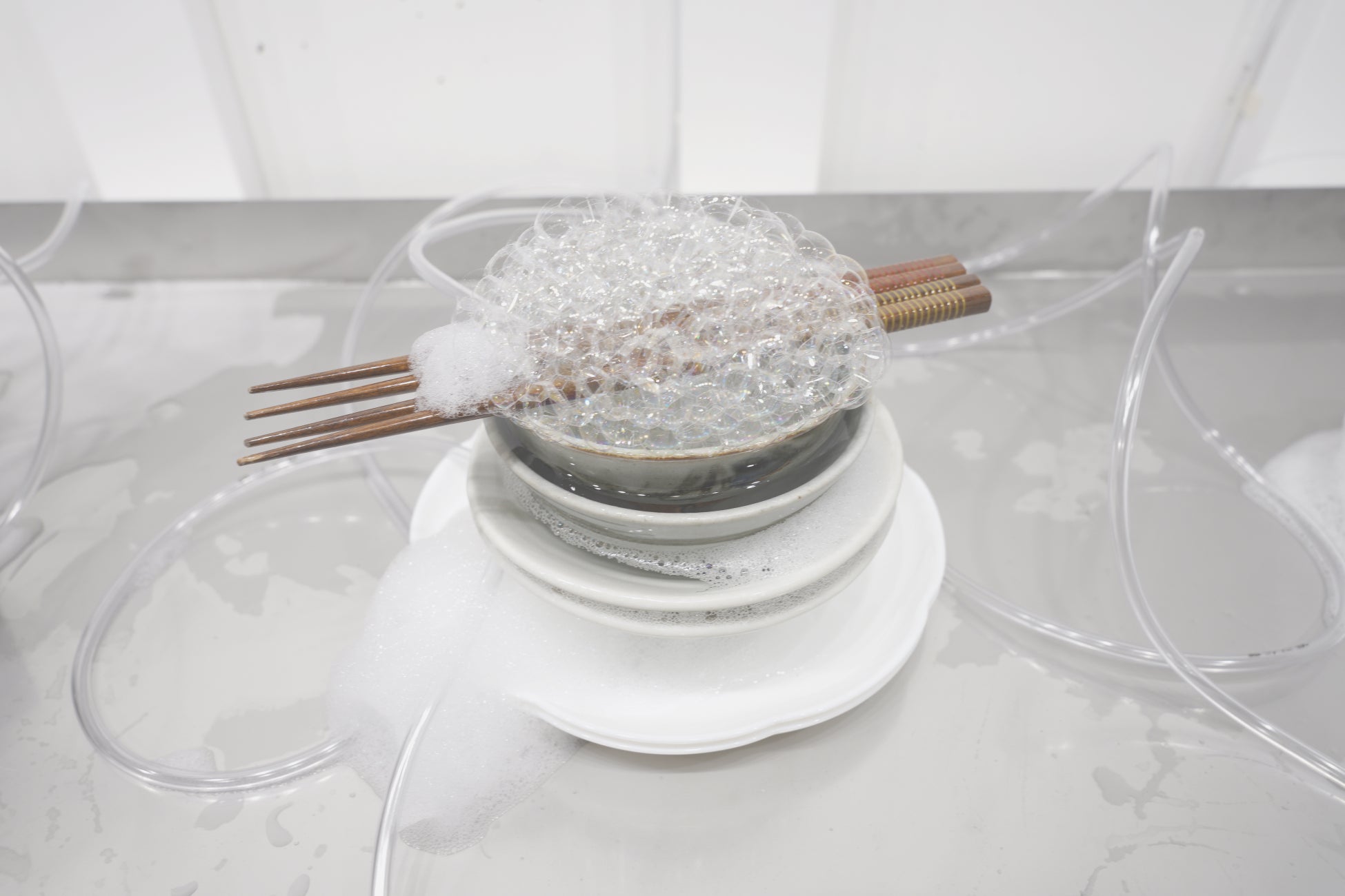 皿に箸、石鹸、ステンレス、ポンプ、水、チューブ、磁石