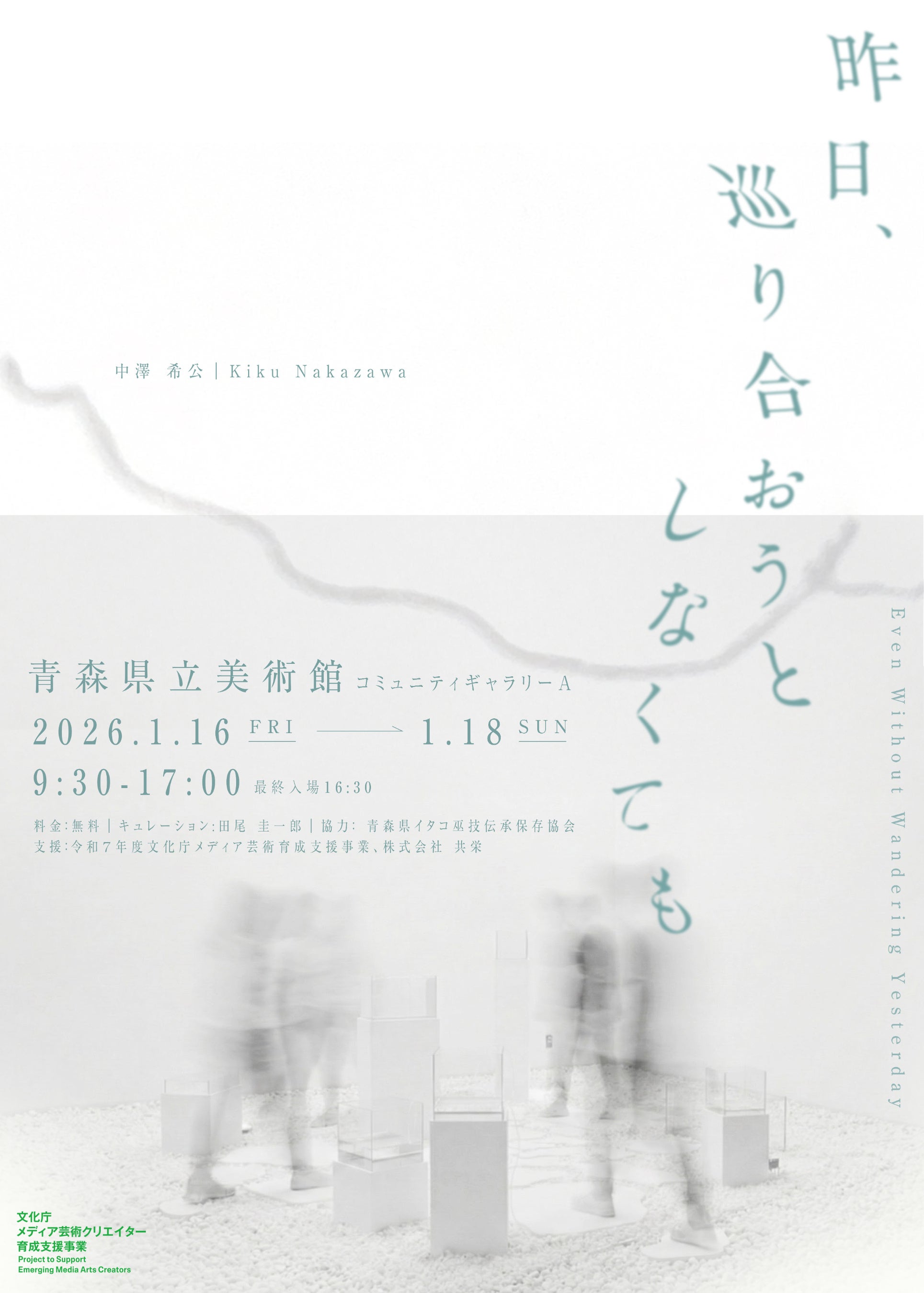 本展は、令和7年度文化庁メディア芸術育成支援事業に採択された展示として、2025年に青森県で行ったフィールドワークをもとに制作された新作個展です。青森の文化や風景、対話のなかで練られた本作を、ぜひご鑑賞ください。