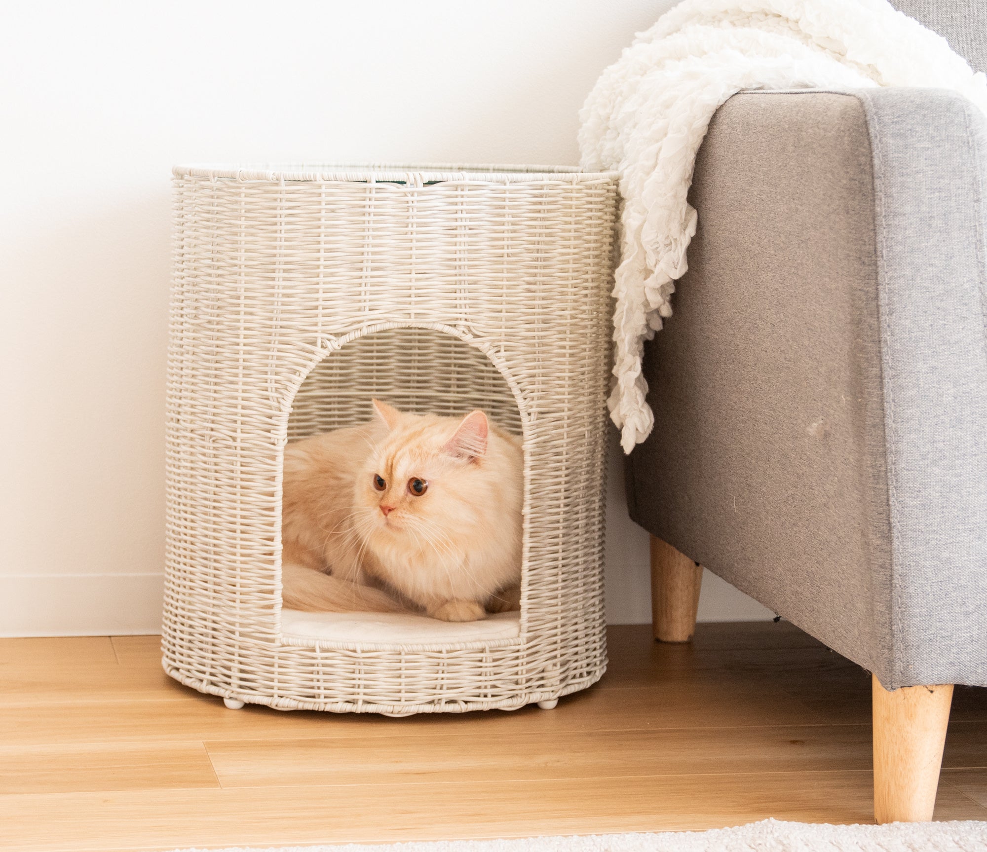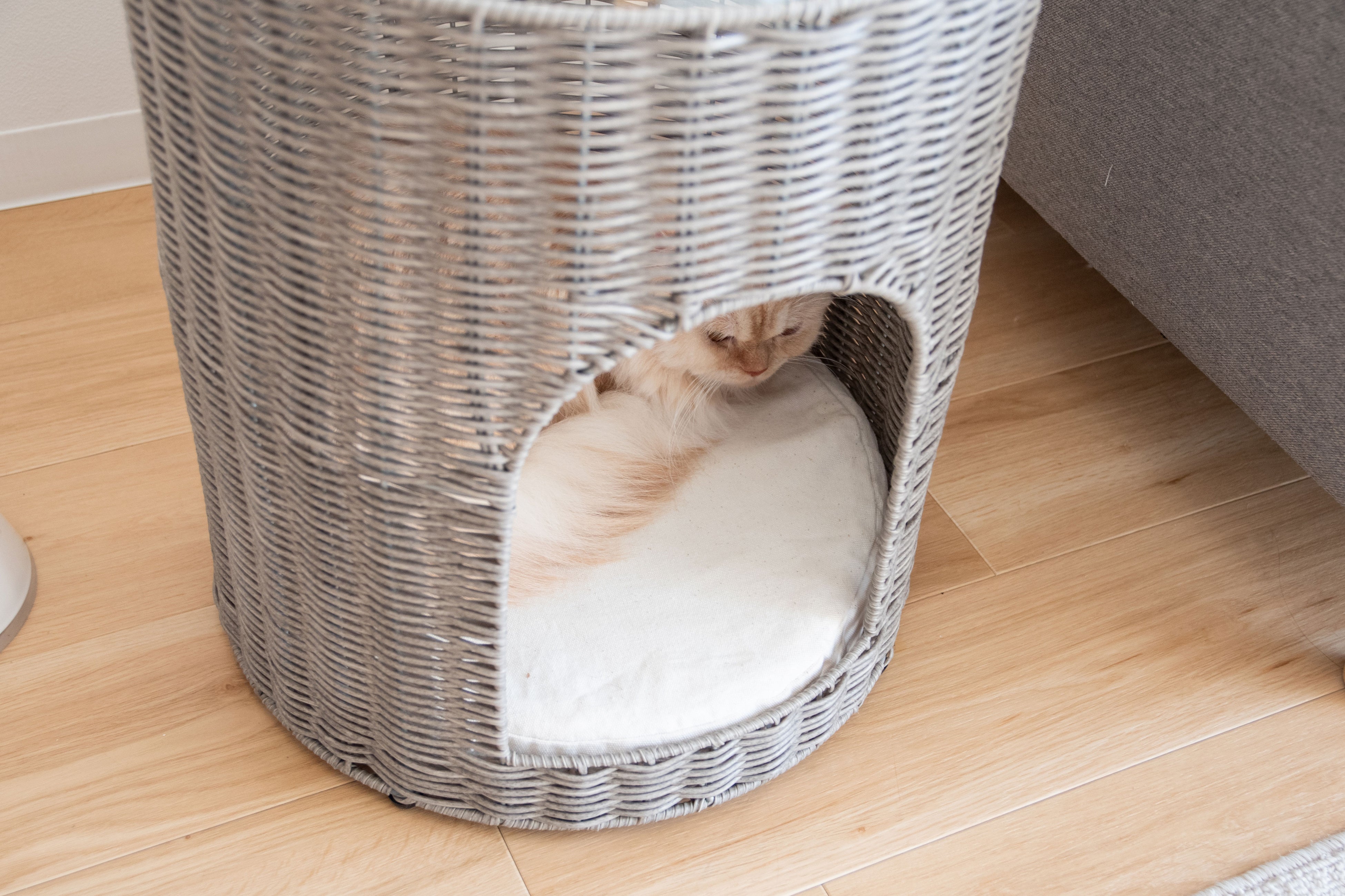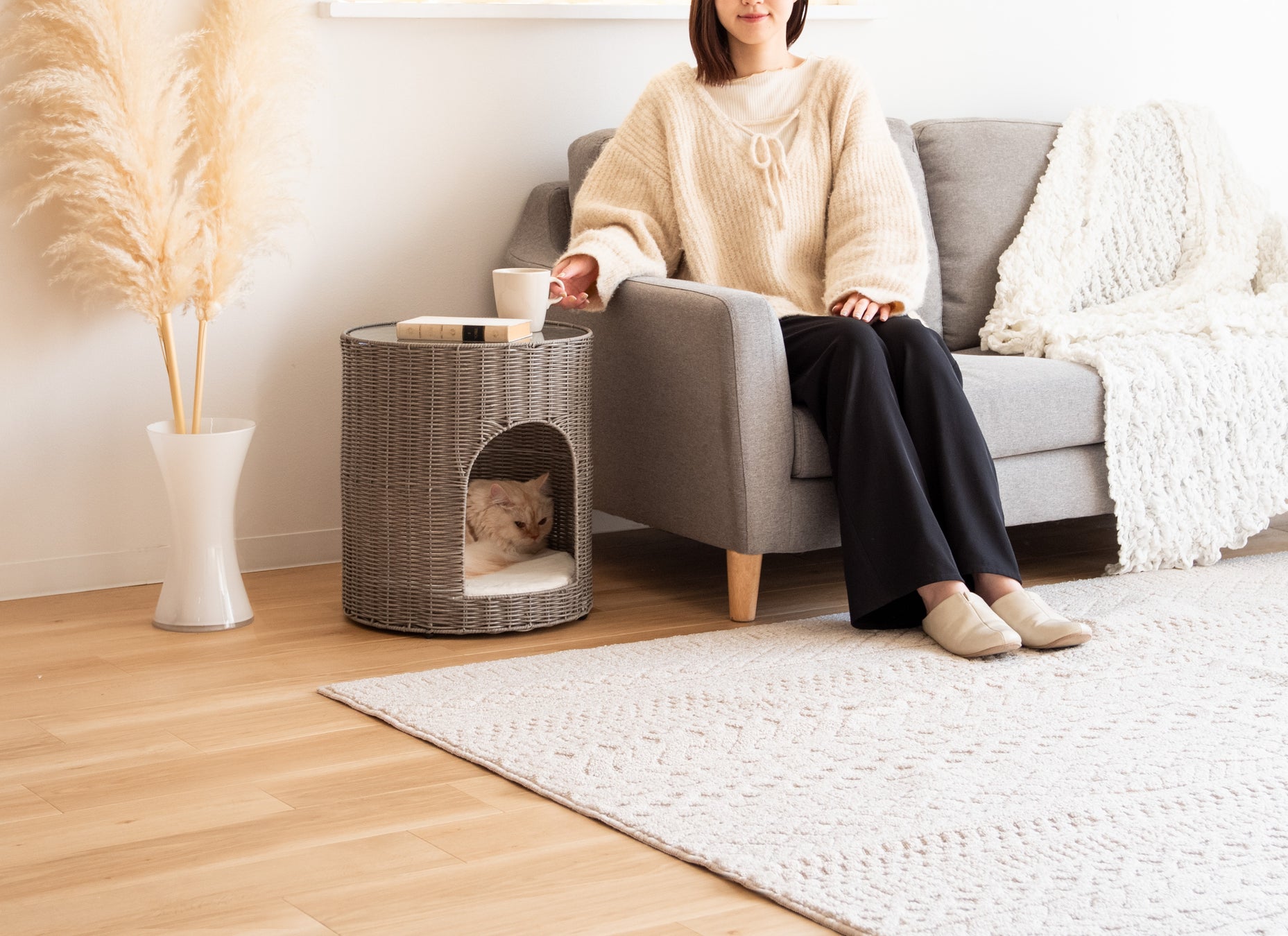 サイドテーブルとして使える猫ちぐらは、リビングでくつろぎながら、猫と一緒に過ごせたら。