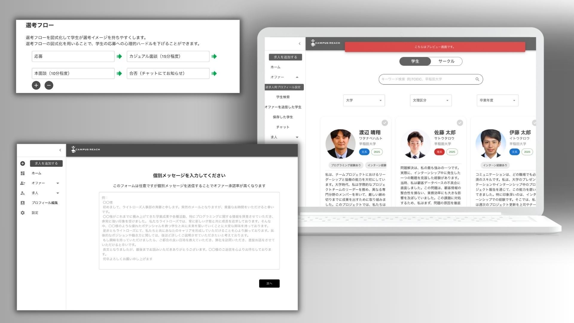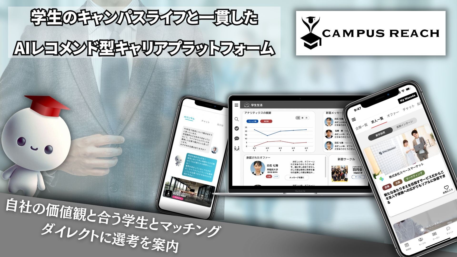 「CAMPUS REACH」は、こうした市場の変化に対応し、新しい時代の学生と企業間のマッチングによる採用活動をサポートするために学生が主体となって開発されました。