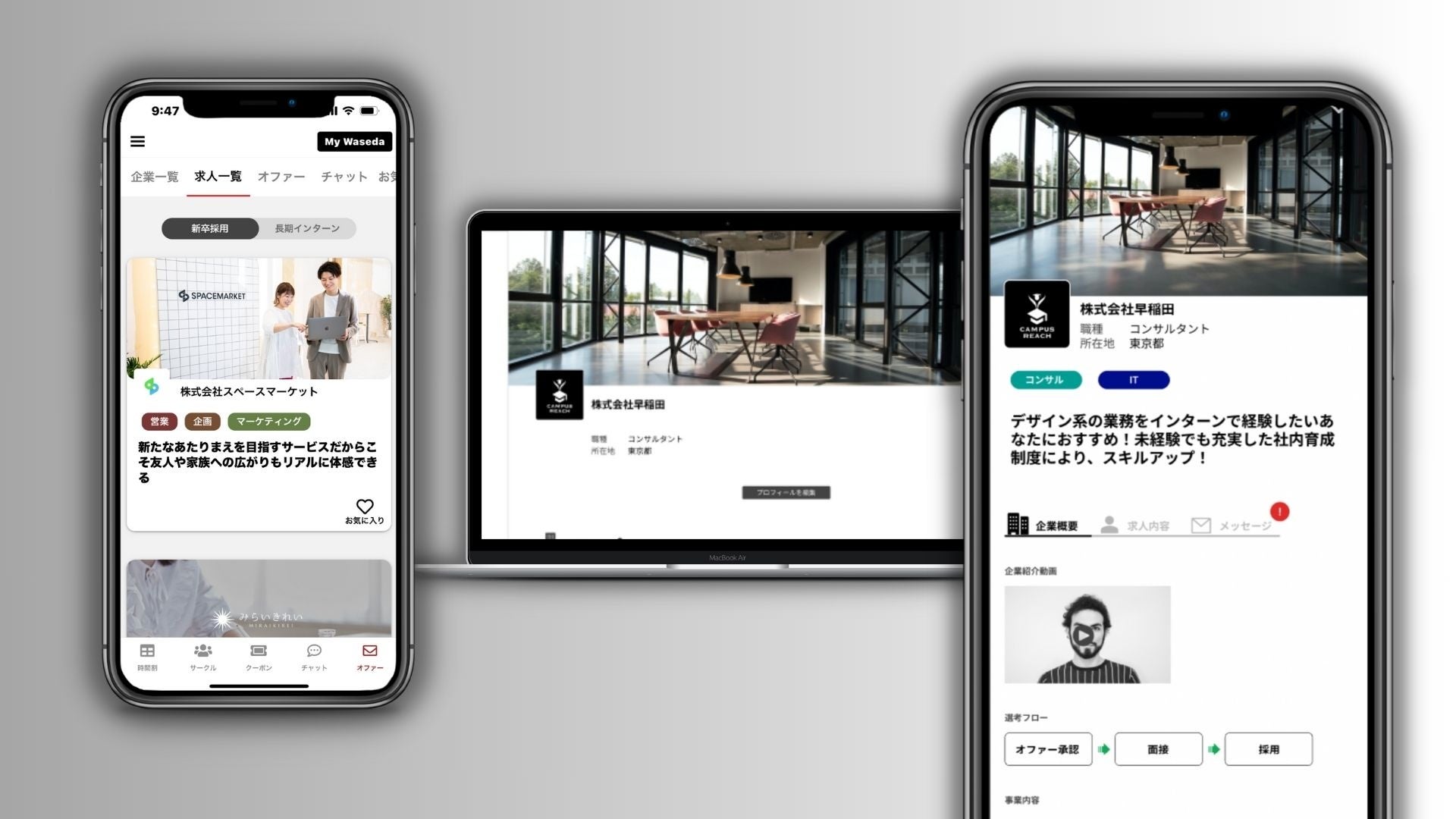 内に本サービスを公開、3月以降に東京大学、京都大学、大阪大学、上智大学、同志社大学を含む全国9大学でのアプリリリースを行います。また、リリースを記念して、求人企業には初期登録料なしでの無料登録を提供しております(※企業審査あり)。