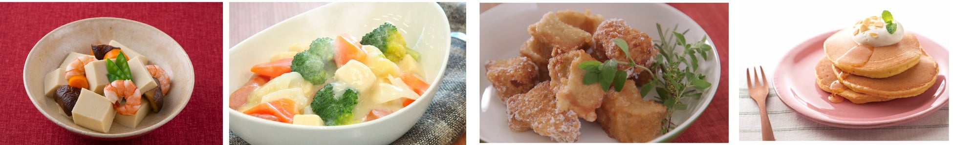 糖質の摂り過ぎは、糖尿病や肥満に繋がる恐れがありますが、高野豆腐は、穀物類やいも類などと比べても、糖質の量が非常に少ないのが特徴。お菓子作りなど、小麦粉の代わりに高野豆腐を使うことで、無理なく糖質をカットできるほか、お肉の代わりとして使うこともできるので、アレンジ次第で、さまざまな健康レシピに活用いただけます。