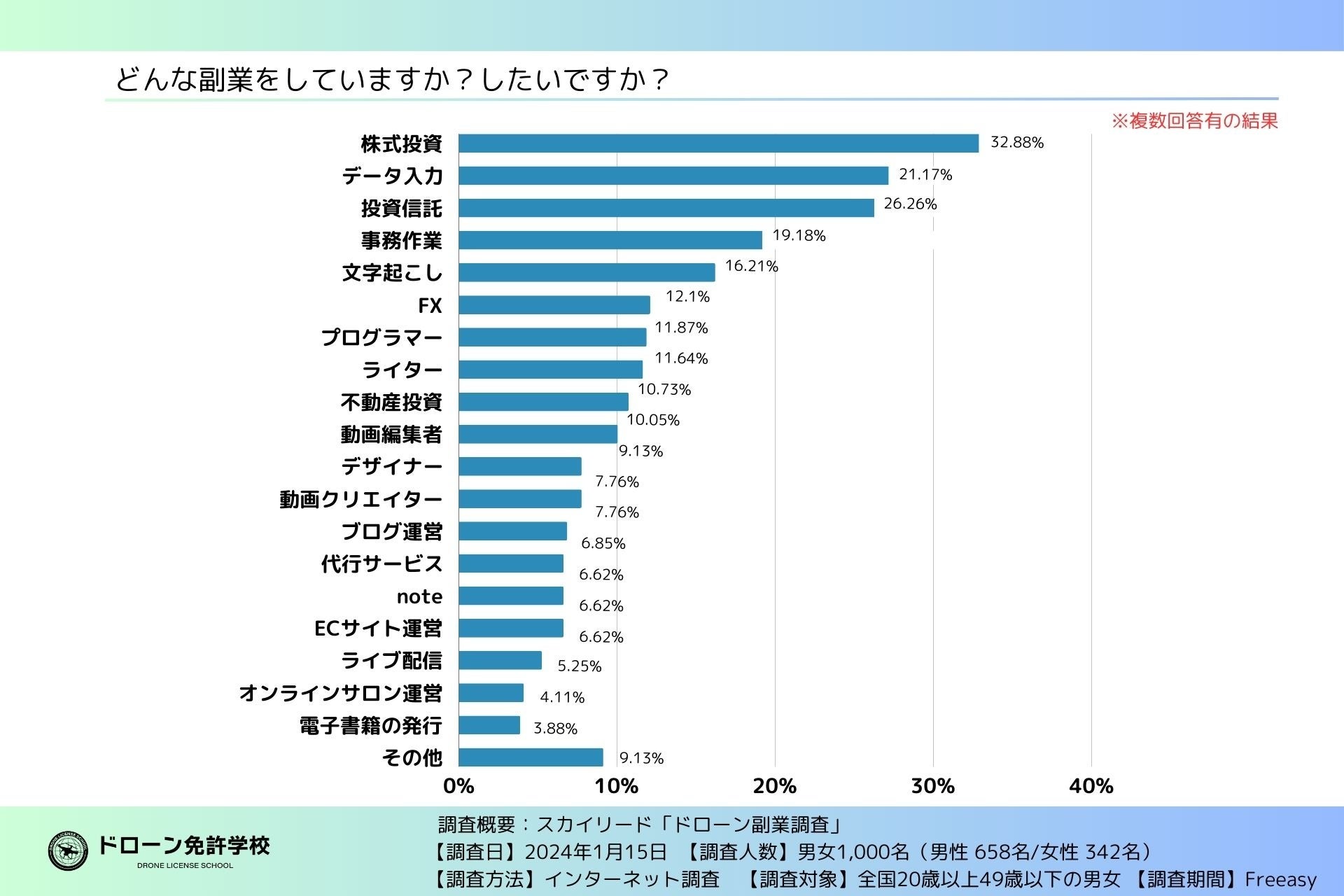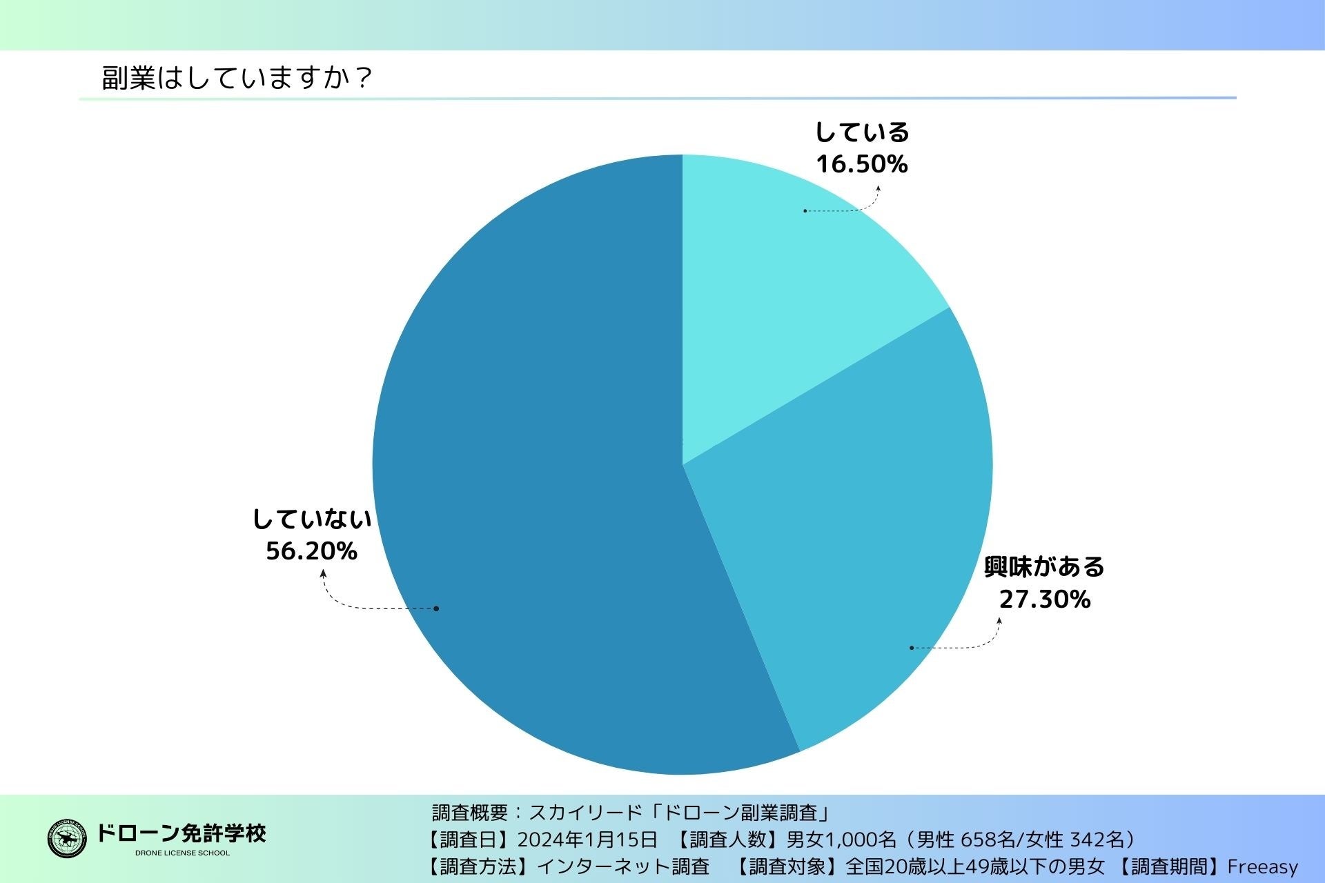 【 ドローン免許学校が1,000人に副業調査】約4割が『副業を営む・興味がある』と回答。うち約3割が『ドローン副業に興味あり』。