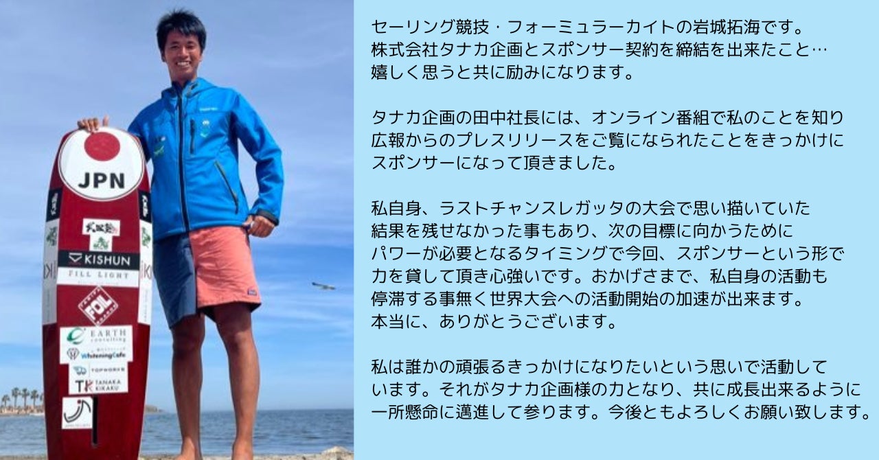 株式会社タナカ企画(本社:東京都港区、 代表取締役社長:田中寛之)は、セーリング・フォーミュラーカイト選手の岩城拓海(以下、岩城選手)とスポンサー契約を締結いたしました。