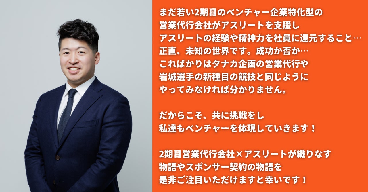 タナカ企画は、ベンチャー企業特化型の営業代行会社です。柔軟な新しい発想や未知の困難を乗り越えるベンチャー企業の挑戦を営業代行という形で支え、応援しております。そのシンパシーも岩城選手に感じたことも大きな要因です。