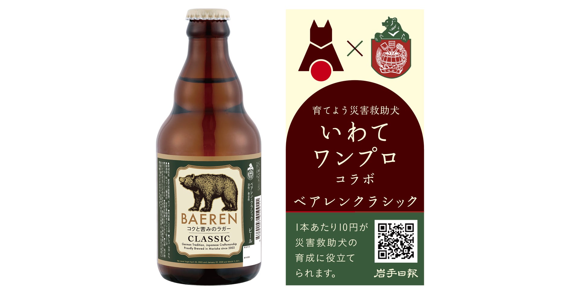 株式会社岩手日報社(本社・岩手県盛岡市、川村公司代表取締役社長)は、事務局を務める「育てよう災害救助犬プロジェクト『いわてワンプロ』」の一環で株式会社ベアレン醸造所(本社・岩手県盛岡市、嶌田洋一代表取締役社長)と連携し、特別仕様のクラフトビール、「いわてワンプロ」コラボ「ベアレンクラシック」が11月1日(水)より1万本の数量限定で販売されます。
