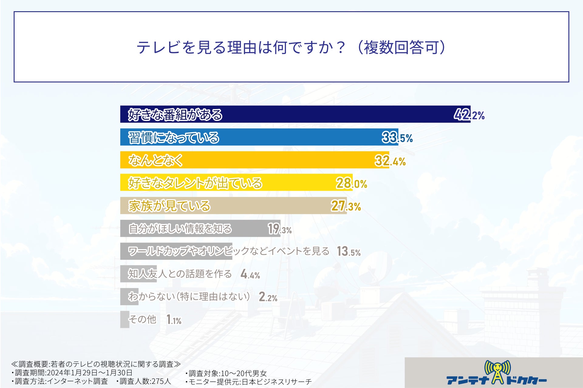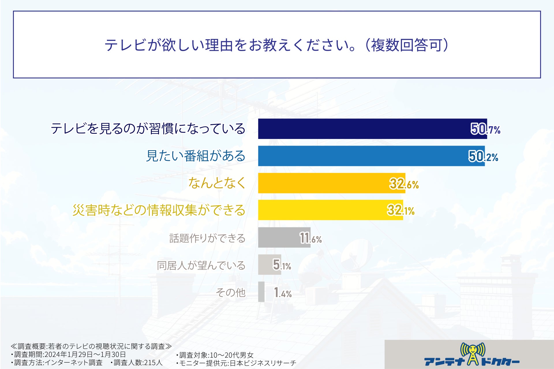 ほぼ同率で「テレビを見るのが習慣になっている(50.7%)」と「見たい番組がある(50.2%)」が、多くの票を集めました。