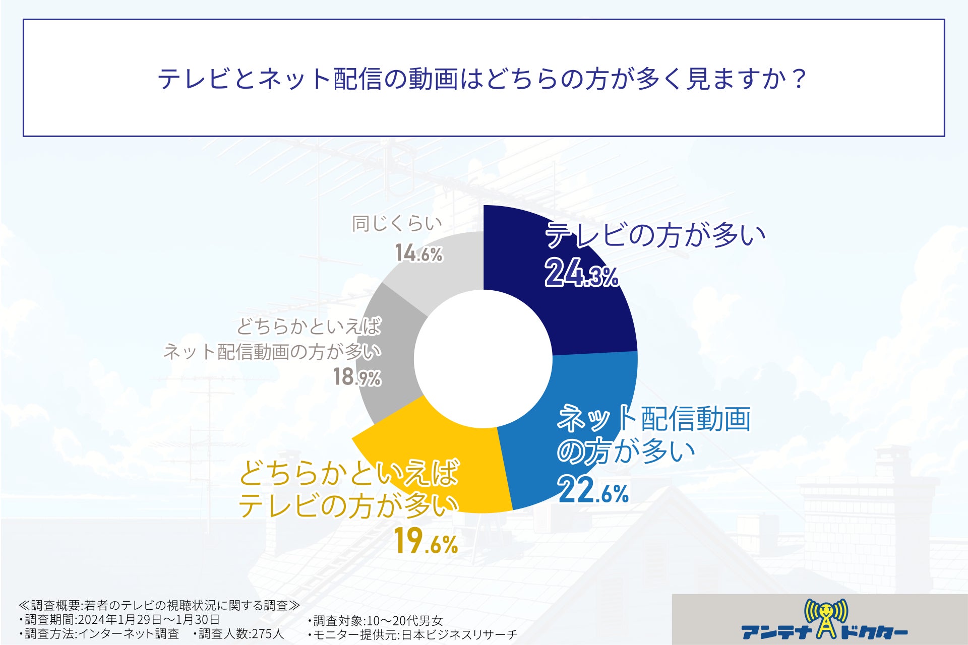 「テレビの方が多い」と回答した人が、「ネット配信動画の方が多い」と回答した人を1.8%上回りました。