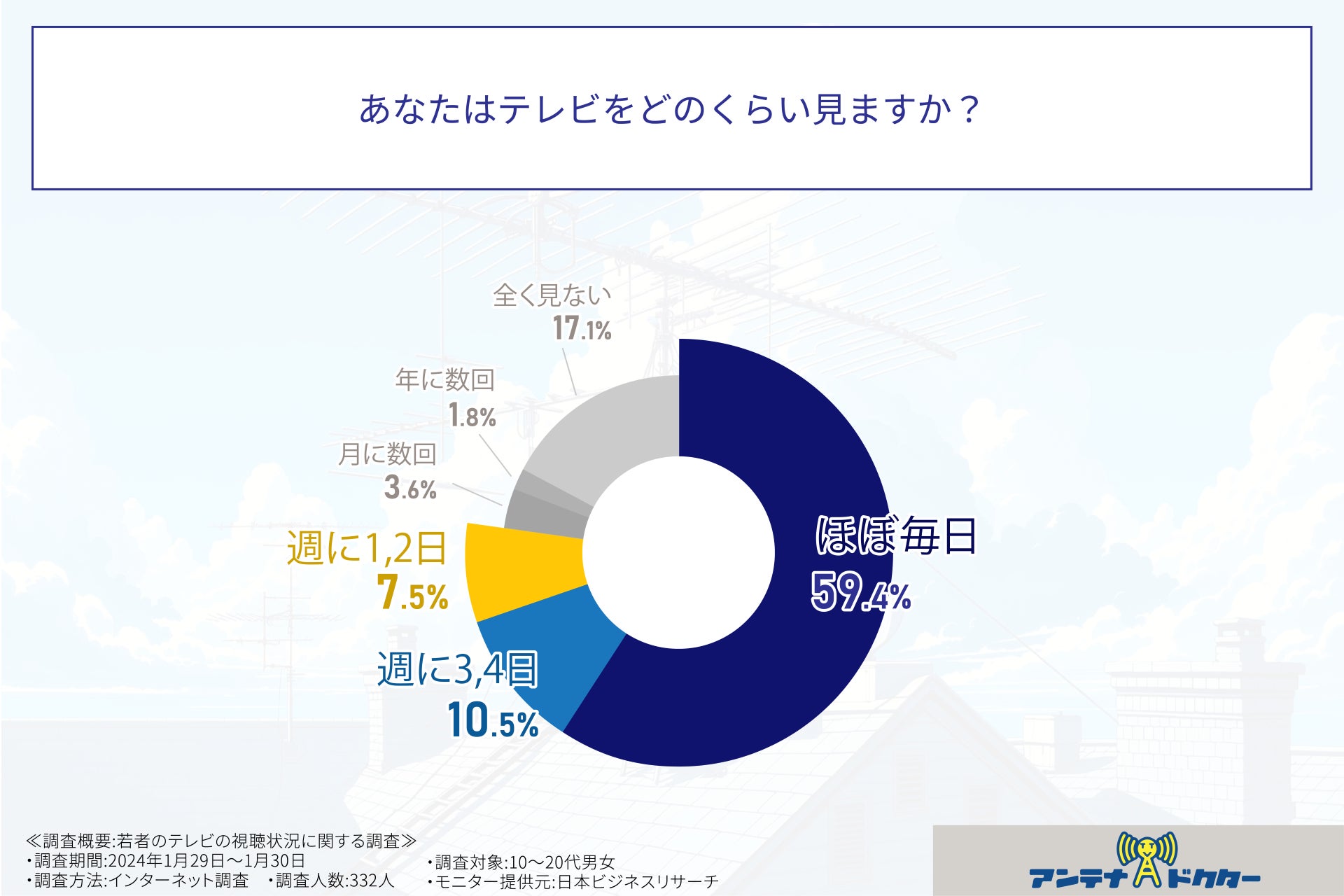 アンテナドクター(本社:奈良県奈良市、代表取締役:松田 陽平)は、この度、10~20代男女332人を対象に、テレビの視聴状況に関する調査を実施しましたので、お知らせいたします。