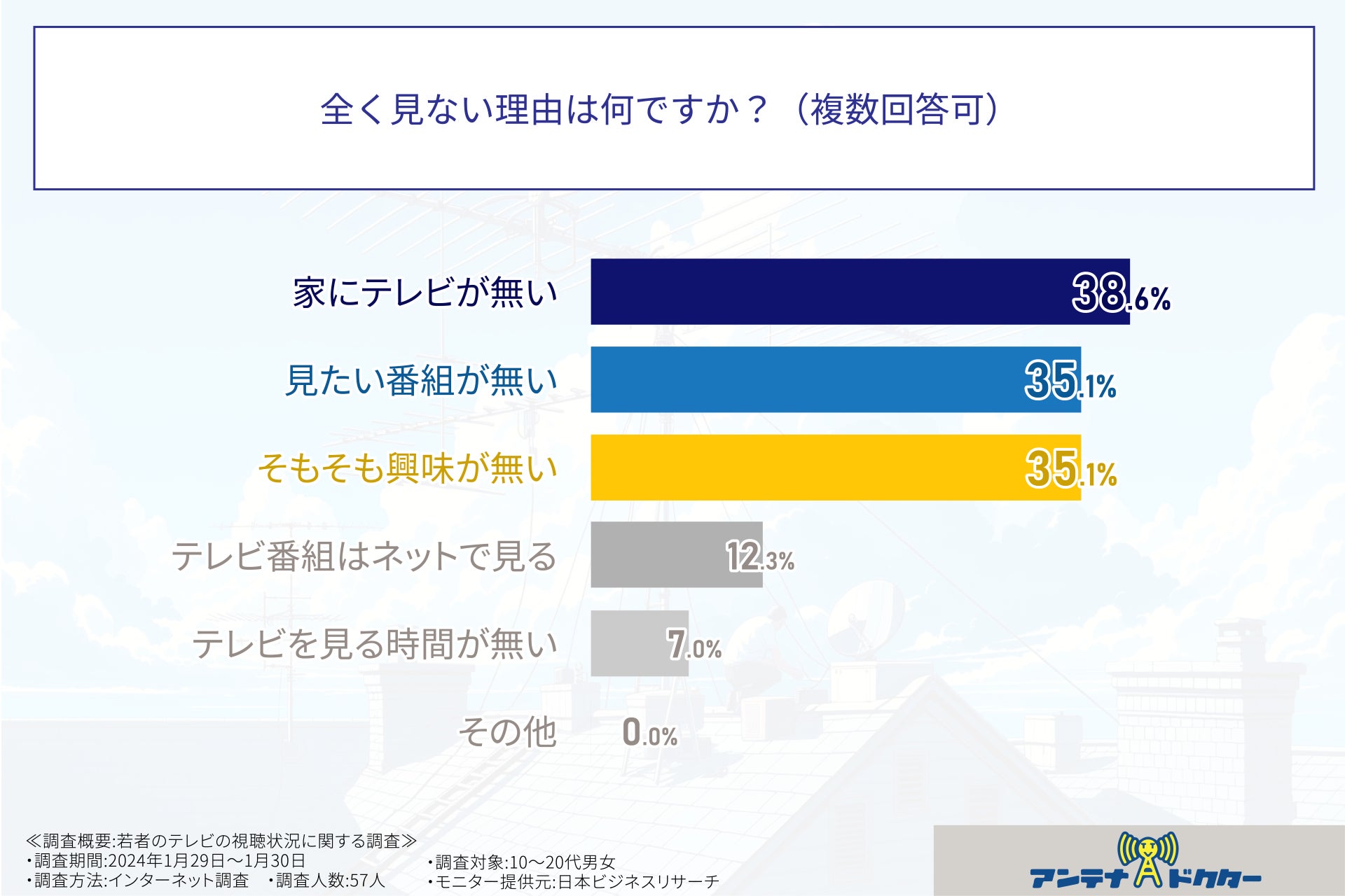 回答にバラつきがありましたが、最も多かったのは「家にテレビが無い(38.6%)」という理由でした。次いで目立ったのが、「見たい番組が無い」と「そもそも興味が無い」がそれぞれ同率で35.0%となりました。