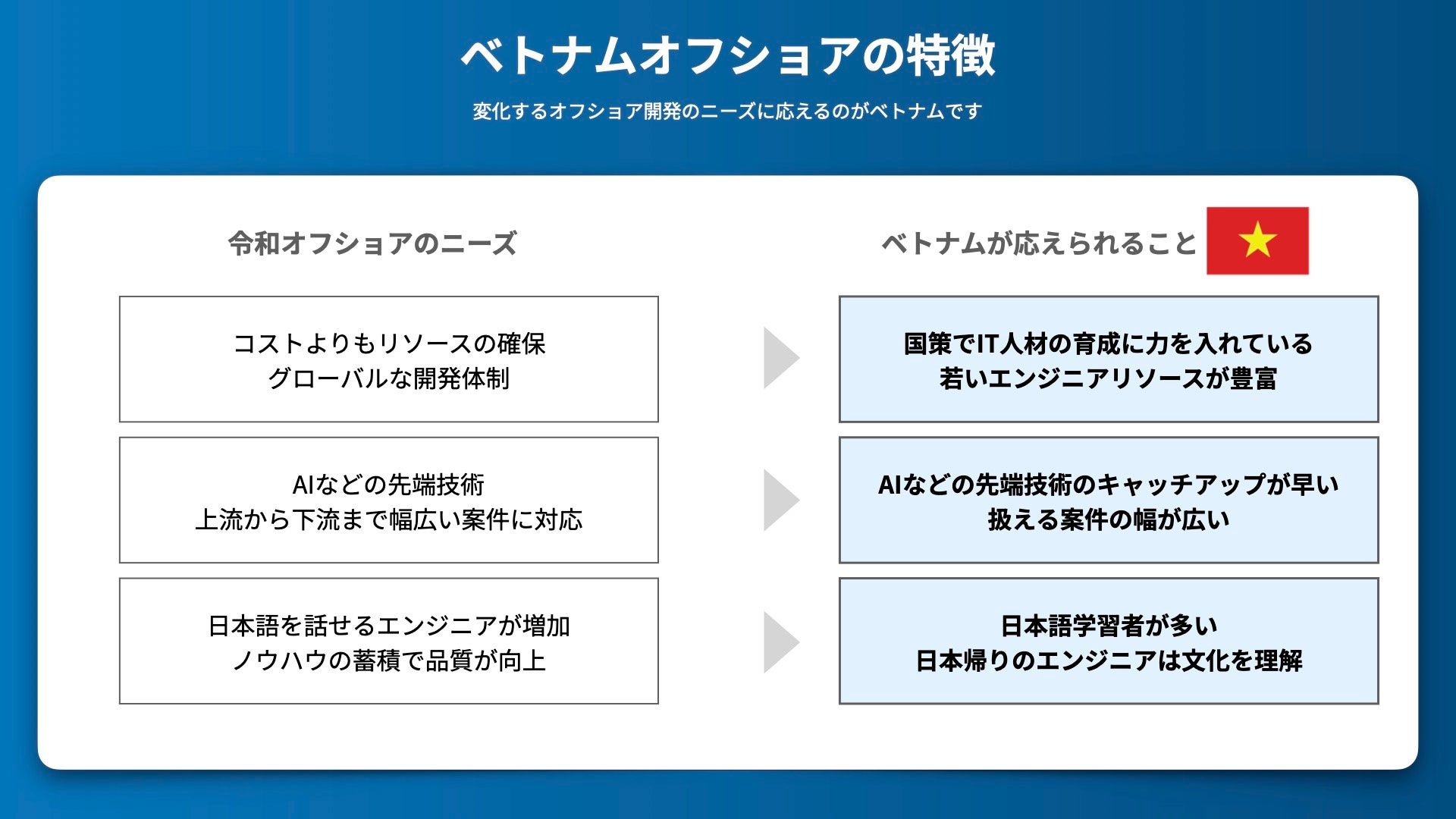 ベトナムは、日本の企業にとって単なるコスト削減のためのオフショア開発先ではなく、高品質な開発と円滑なコミュニケーションを実現する重要なパートナーとなり得ます。令和という新時代におけるオフショア開発のニーズに、ベトナムは積極的に対応し、両国のビジネスの可能性を大きく拓く存在となります。
