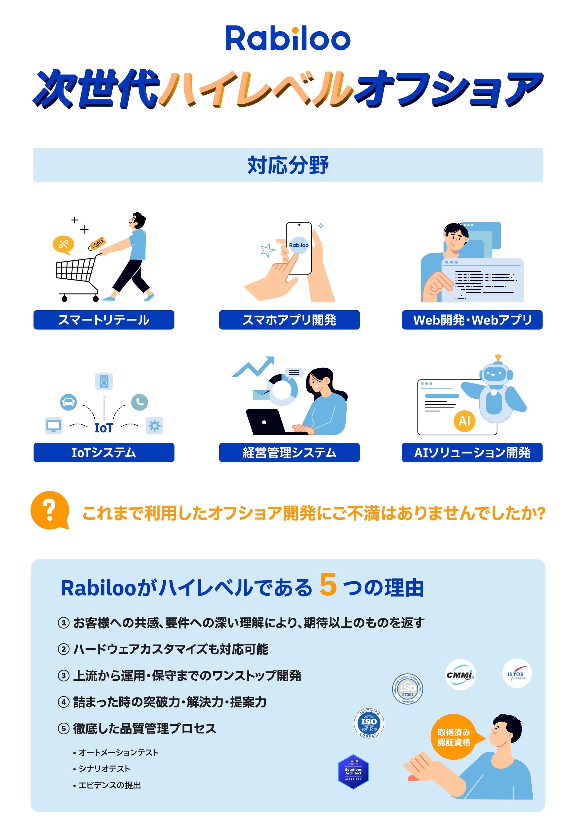 「次世代ハイレベルオフショア」とは、単にコスト削減を目的とした従来の受託型オフショア開発を超越し、AI技術などの先進的なテクノロジーを活用してお客様の戦略的なビジネスパートナーとして深刻なIT人材不足に応える、Rabilooが提唱する新世代のアウトソーシングモデルです。このアプローチでは、海外の開発チームはプロジェクトの上流工程から参加し、計画立案、要件定義、システム設計などの初期段階から対応します。また「ラボ型開発」の形で、Rabilooの豊富なエンジニアリソースの中から案件専用のチームを構築し、お客様専属の開発リソースとして短期または長期にわたって柔軟に利活用していただくことが可能です。Rabilooのスマートオフショア開発は、コミュニケーション能力はもちろんのこと、提案力や解決力の高さ、品質、スピード、イノベーションの各面でお客様の期待を超える成長を実現することを目指します。