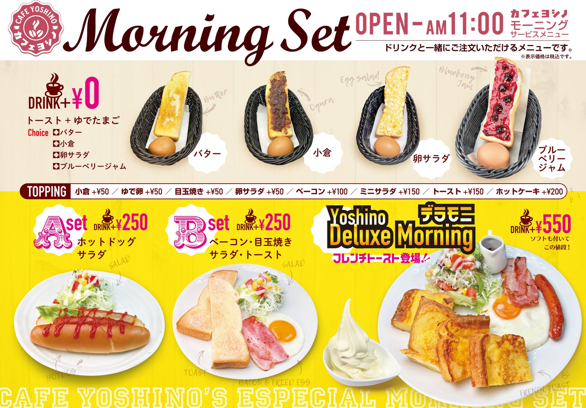開店から閉店まですべての時間帯に無料サービスが付くカフェヨシノのお得なメニュー