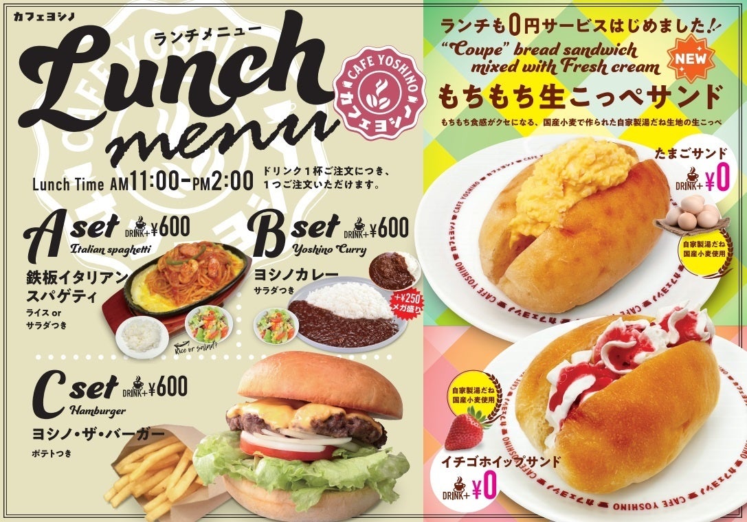 愛知県内に17店舗を展開する喫茶チェーン「カフェヨシノ」は、『カフェヨシノ中島店』(中川区西中島1丁目206)にて、11時~14時までのランチタイムに、ドリンク代のみで「もちもち生こっぺサンド」を無料提供する「0円ランチサービス」を5月1日よりスタートします。モーニング文化が根付く愛知の喫茶店文化の活性化に貢献し、地域社会とのつながりを深めていきたい、という思いを形にしました。