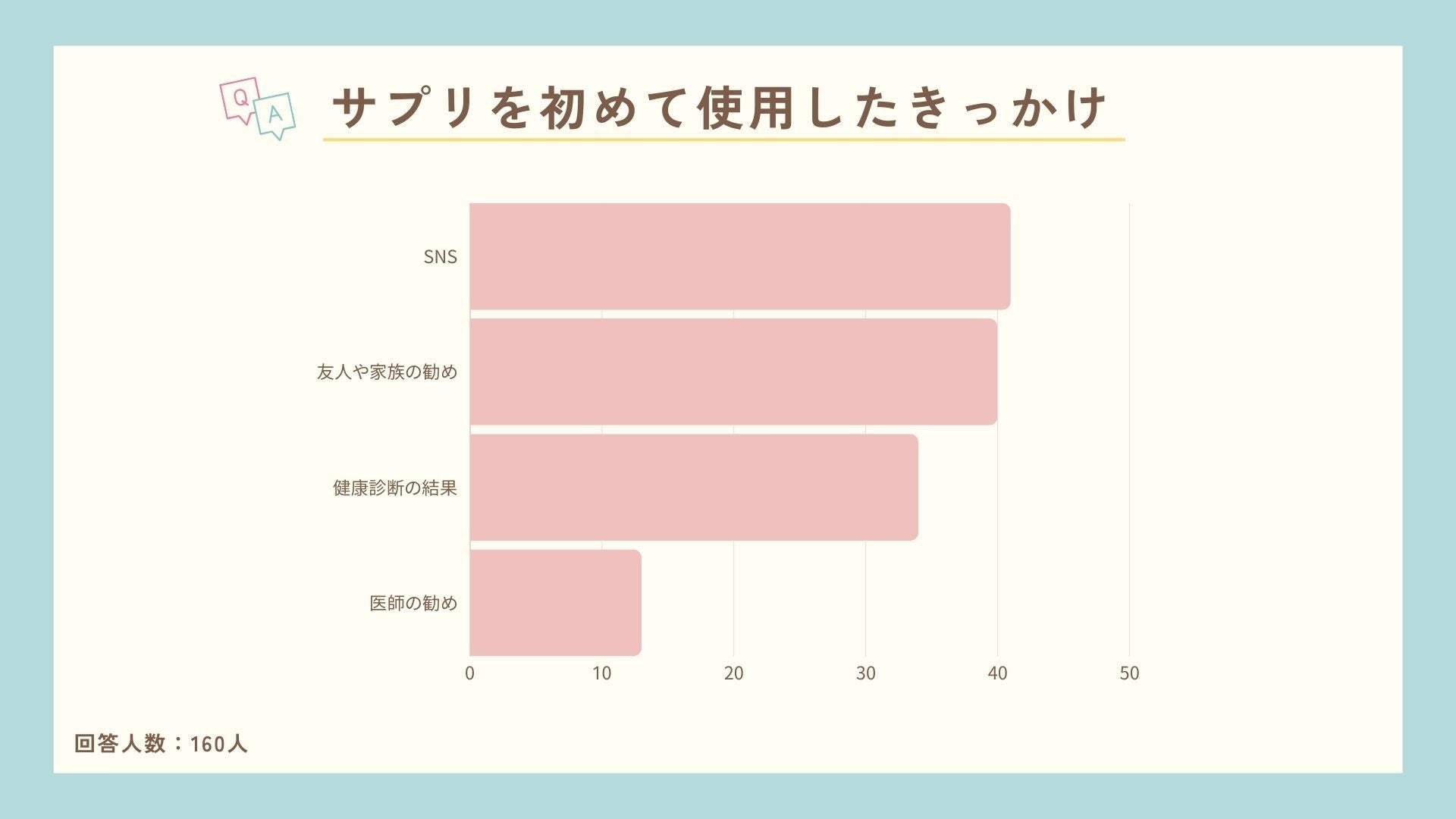 何をきっかけにサプリを使用しはじめたかという質問に対しては、SNSが最も多く25.6%という結果でした。