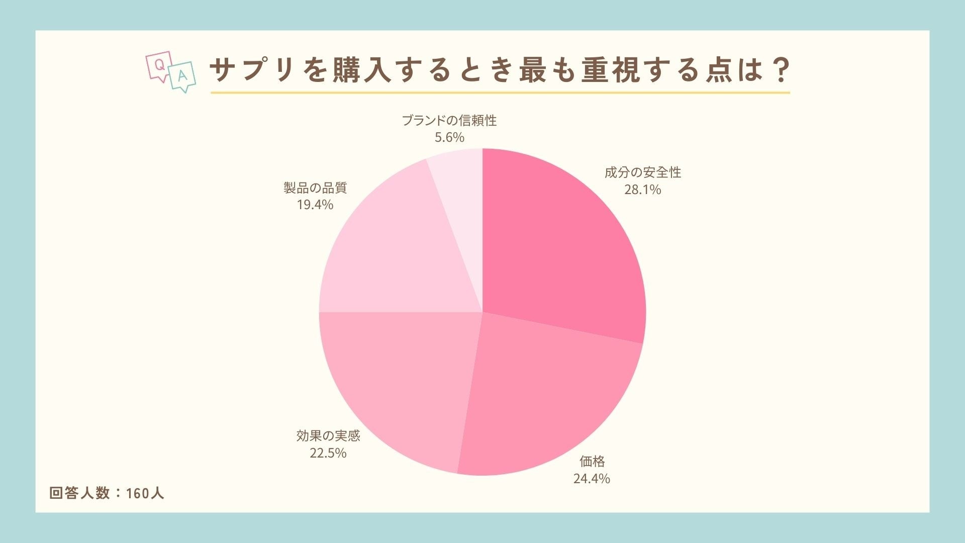 スキンケアなどの化粧品では価格を重視する人も多いですが、サプリに関しては「成分の安全性」を重視する人が一番多い28.1%という結果でした。