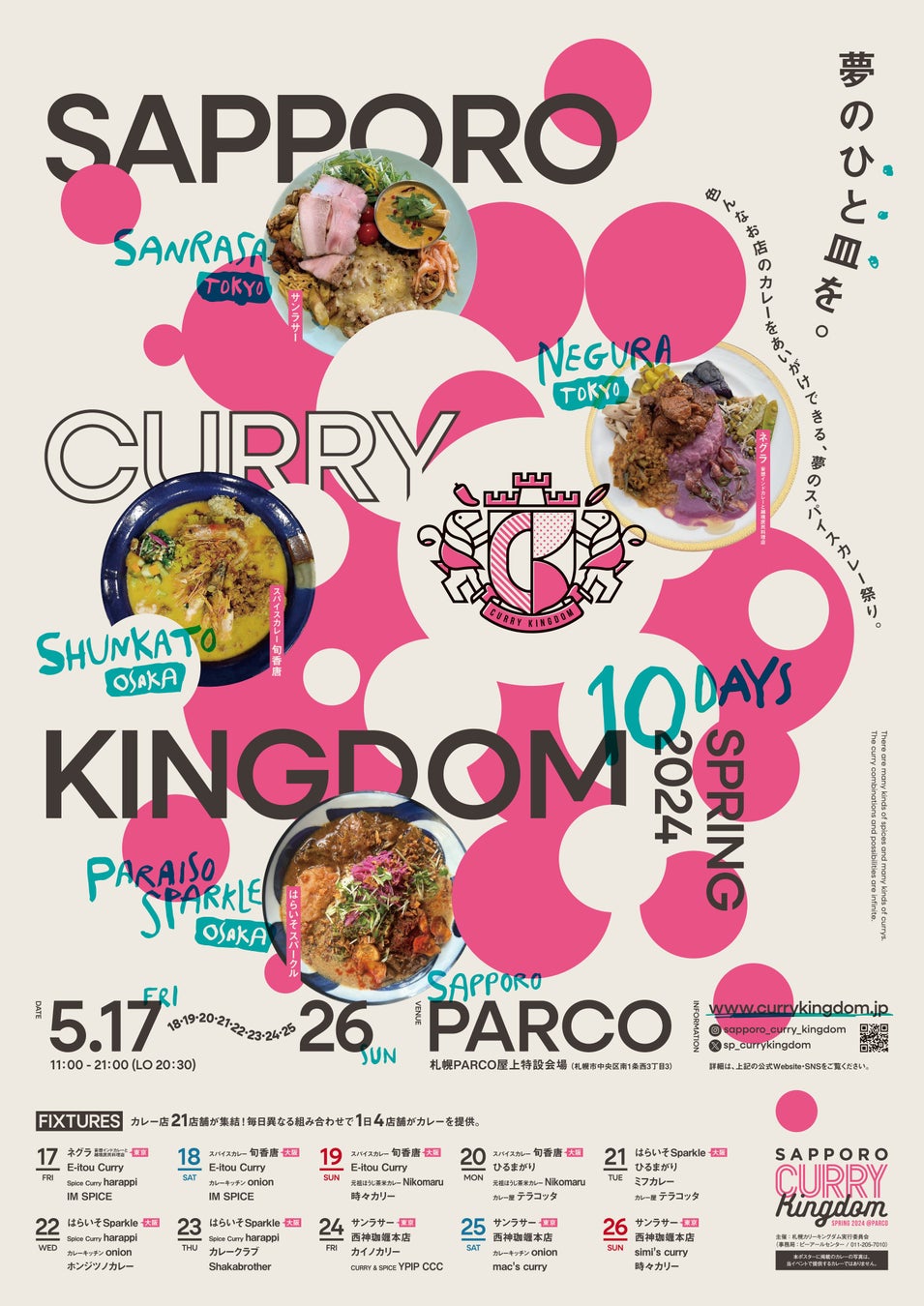 色々なカレー屋さんの味を、一皿で味わいたい。それぞれのカレーを堪能してから、最後は混ぜて食べる。そんな、カレーフリークの皆様の夢が叶うイベント、札幌カリーキングダム。今春は、道外から4店舗・道内から17店舗、計21店舗 27種類のスパイスカレーが札幌PARCOに集結!