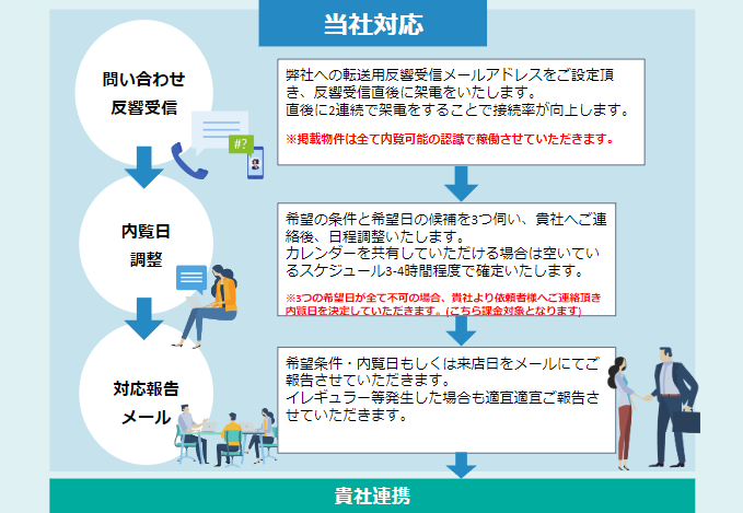 営業人員不足で、反響へスピーディーに対応しきれていないなどのお困りごとを持つ企業様へ、不動産業界経験と、豊富な営業経験を持った弊社営業スタッフが、電話・メール・SMSにてスピーディーかつ丁寧に対応し、アポイント数を最大化いたします。
