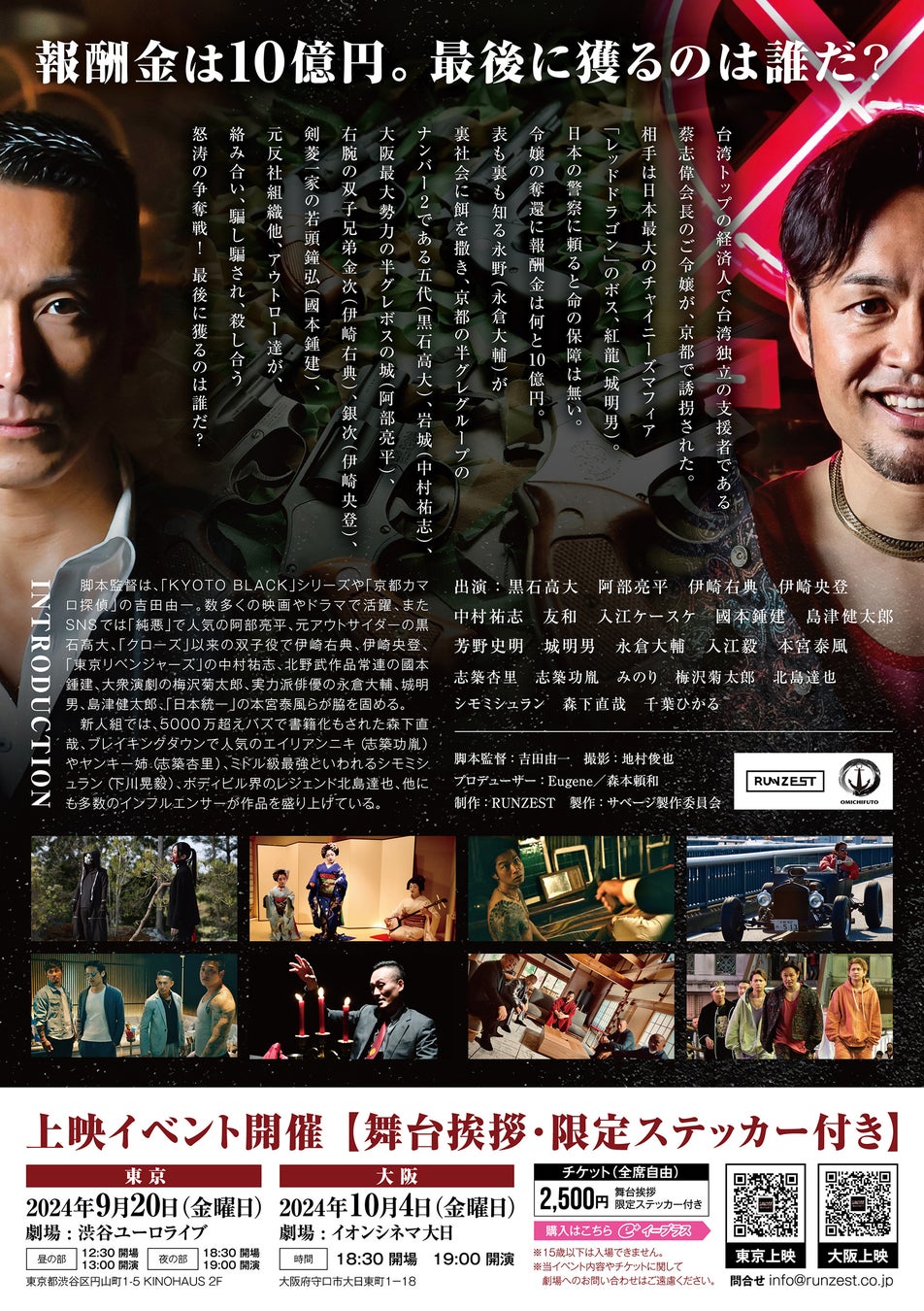 映画「KYOTO BLACK」シリーズや「京都カマロ探偵」などを手がけた吉田由一監督がメガホンを取った話題のこの映画、ベテランから有名インフルエンサーまで、多彩な出演者でラインナップされています。