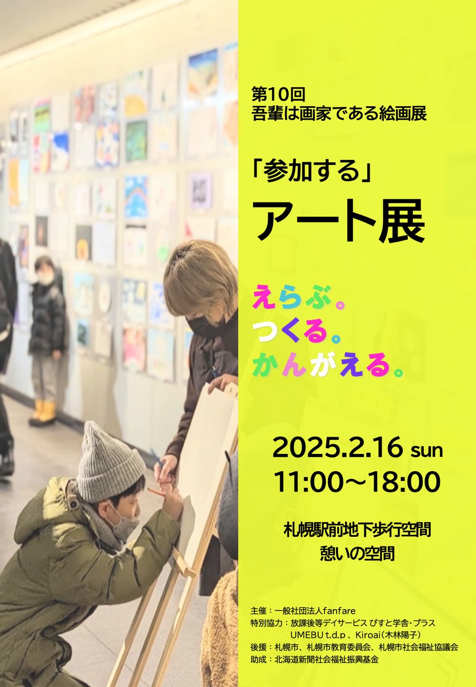 一般社団法人fanfare(所在地:札幌市清田区、代表理事:伊藤真哉)は、札幌市内の高校生以下の生徒・児童及び児童発達支援・放課後等デイサービスに通う児童・生徒を対象とした、作者非公表のファン投票型絵画展「吾輩は画家である」を含む「参加する」アート展を、2025年2月16日(日)に、札幌駅前地下歩行空間で開催致します。