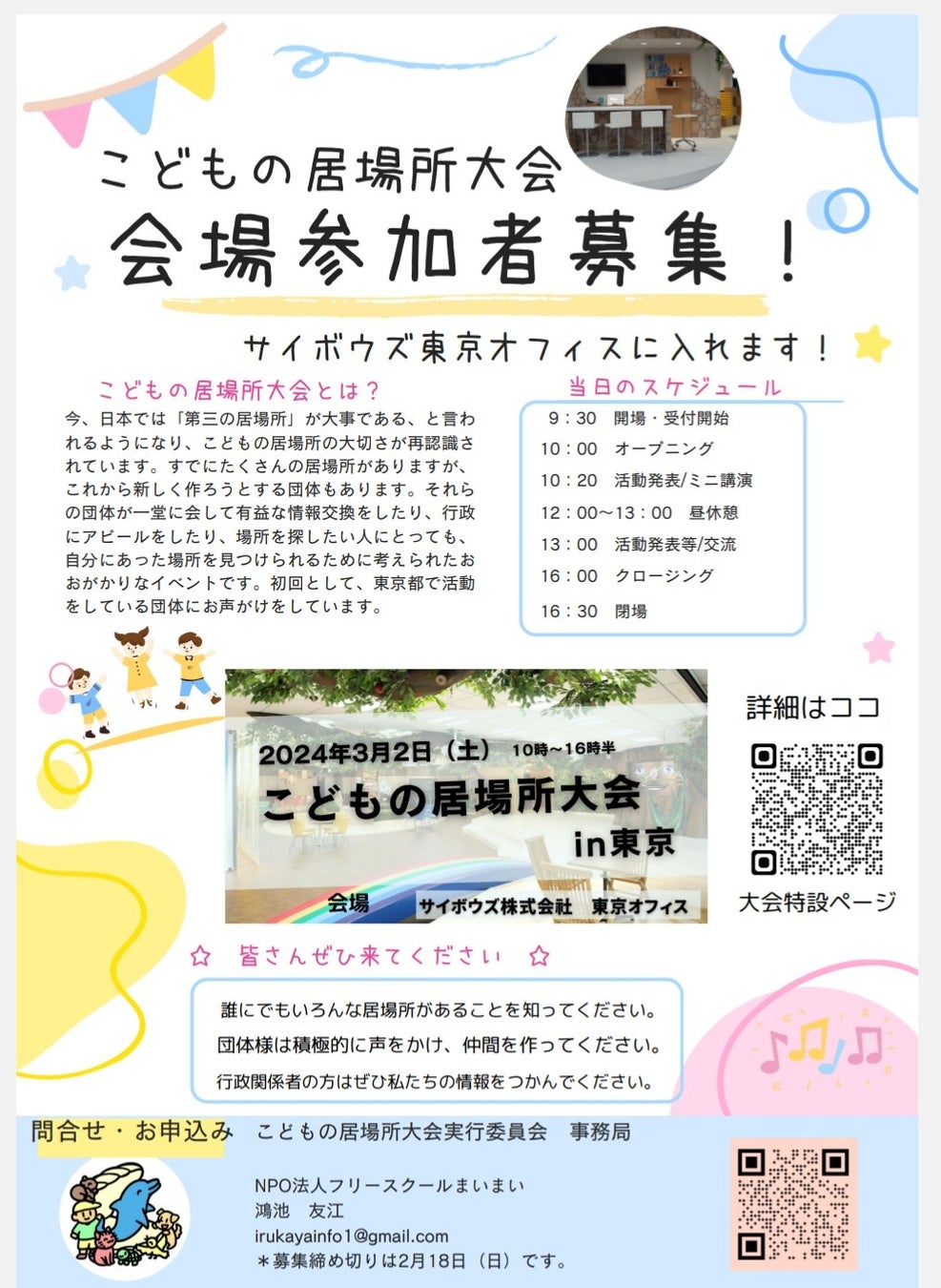 NPO法人フリースクールまいまい(所在地:渋谷区、代表:鴻池友江。以下、フリースクールまいまい)は、2024年3月2日(土)10時~16時30分の終日でサイボウズ東京オフィス(中央区日本橋2-7-1 東京日本橋タワー27階)にて開催されるイベント「こどもの居場所大会in東京」を企画する実行委員の統括をしています。