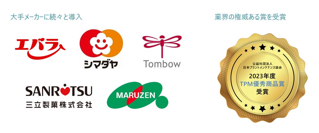M2Xはローンチしてまだ約1年のプロダクトですが、既に多くのメーカー様に愛されています。特に大手メーカー様に選ばれているのが特徴で、エバラ食品工業、シマダヤ、トンボ鉛筆をはじめ、多くのメーカー様に続々と導入いただいております。また、今年2月には日本プラントメンテナンス協会様より、業界で権威ある「TPM優秀商品賞」をいただいております。