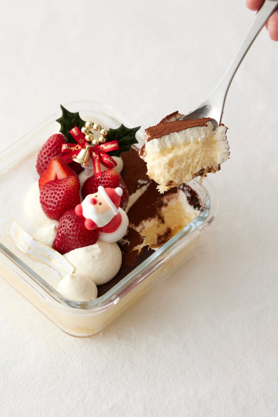Tiramisu No.6の「いちごのクリスマスティラミス」は、濃厚で滑らかなマスカルポーネに甘酸っぱいいちごと可愛らしいサンタクロースのデコレーションを施し、見た目も華やかな一品に仕上げました。小さなお子様でも安心して召し上がれるよう、エスプレッソソースは別添えにし、クリスマスらしいいちごのソースもお付けしました。飽きのこない味の変化をお楽しみください。