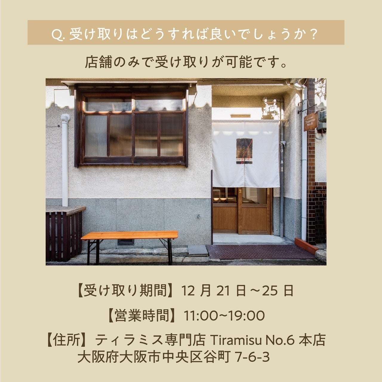 ティラミス専門店Tiramisu No.6 は大阪・谷町6丁目に2023年11月にオープンした路地裏の隠れ家ティラミス専門店です。