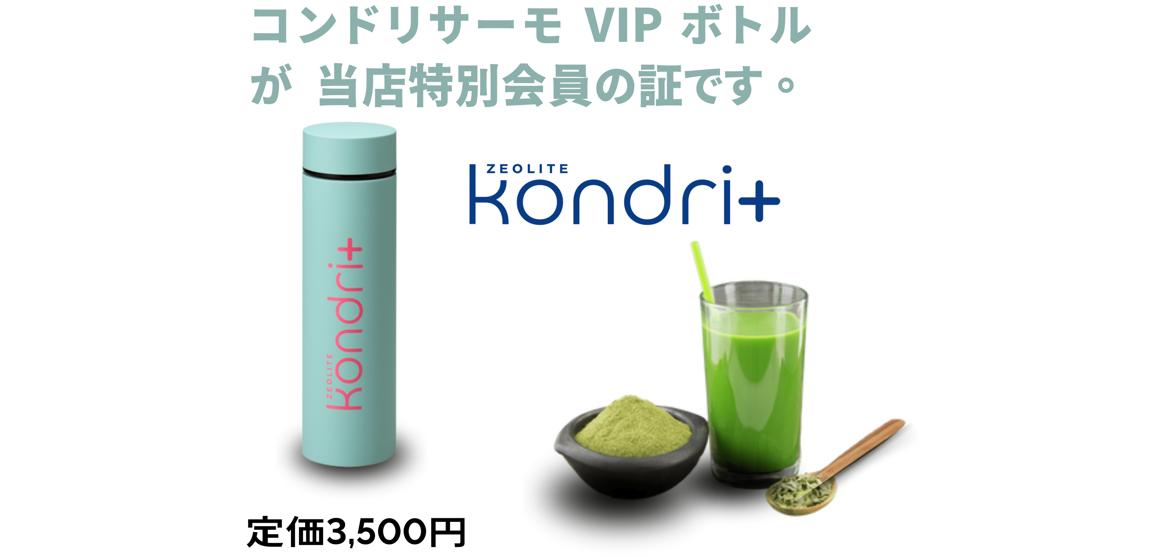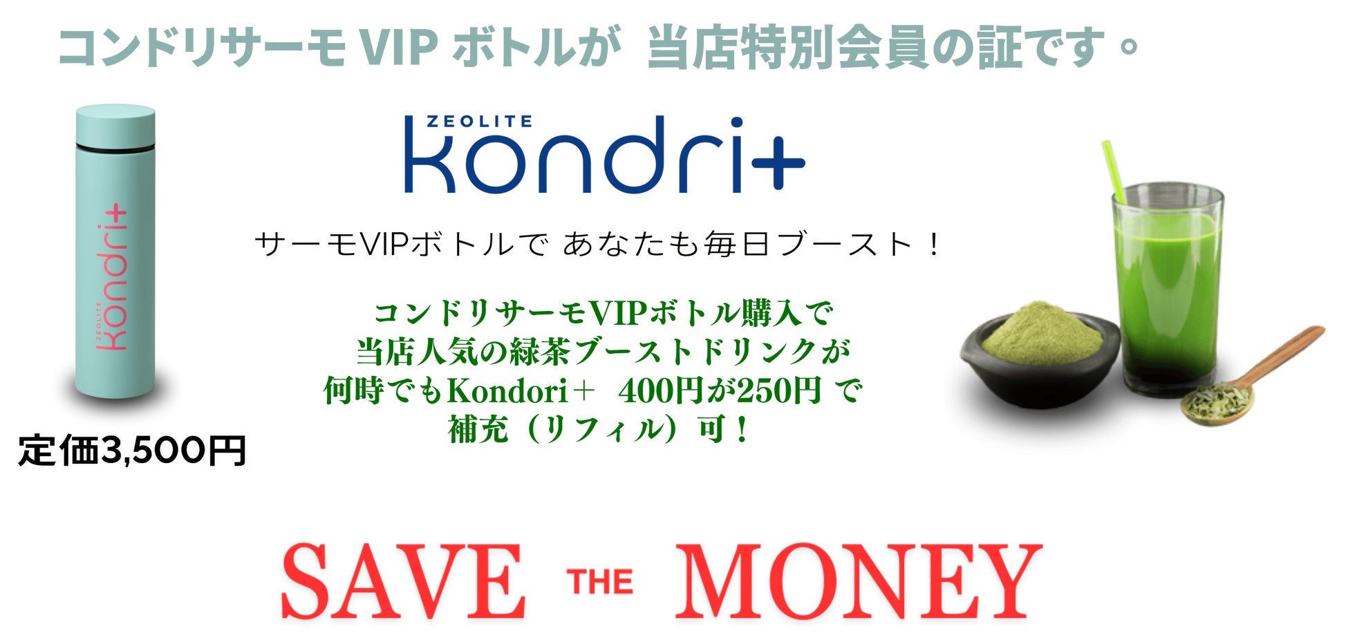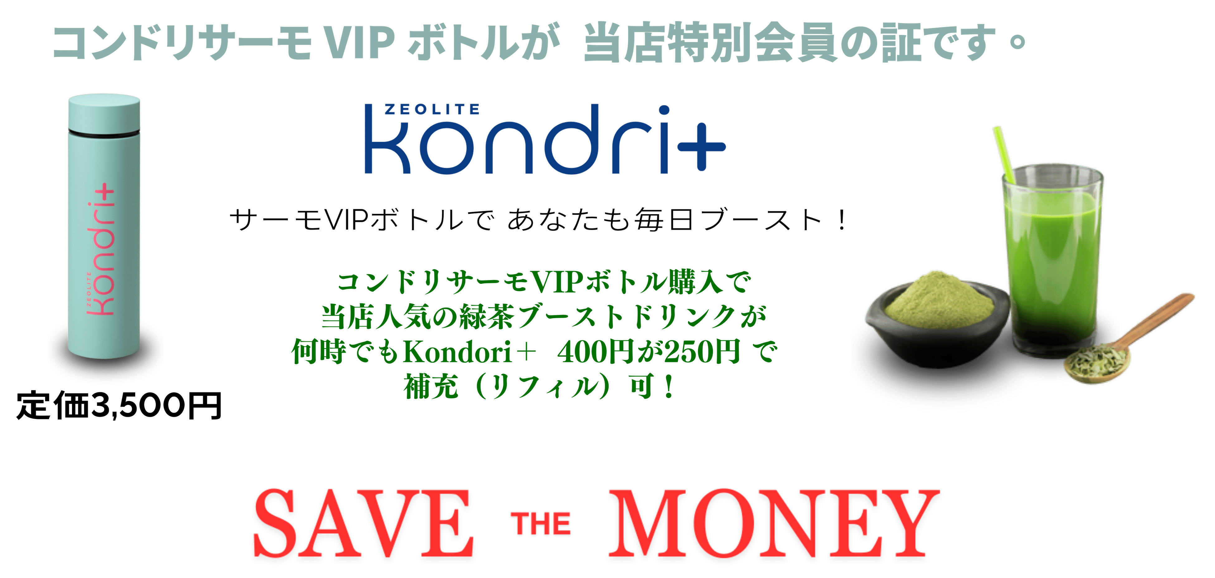 コンドリサーモVIPボトル(3,500円)ご購入で、当店人気の緑茶ブーストドリンク「kondri+ 」400円 が 250円で補充(リフィル)していただけます!