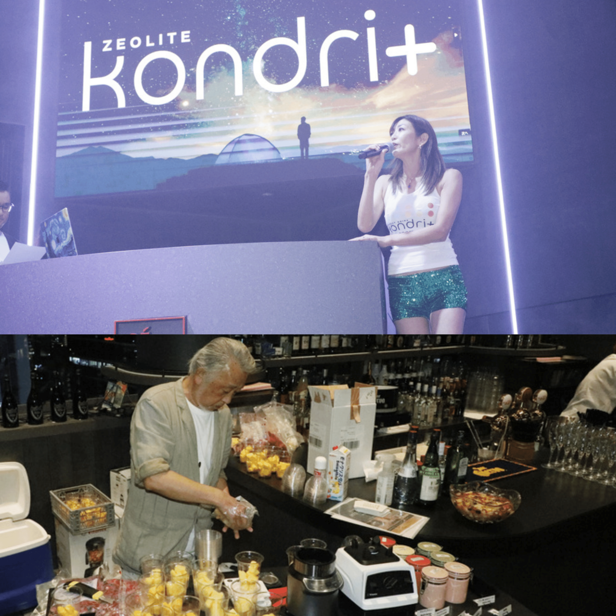 試飲会を兼ねたこのパーティでは、Kondri+ にお酒やフルーツジュースをブレンド。更にブーストパウダーを加え、美味しさとエネルギー全開でお楽しみいただき、海外からの方々も「コンドリ美味しい、美味しい」「元気、元気」と皆様ご機嫌な夜をお過ごしいただきました。