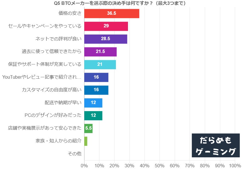 調査5:BTOメーカーを選ぶ際の決め手は何ですか?(最大3つまで)
