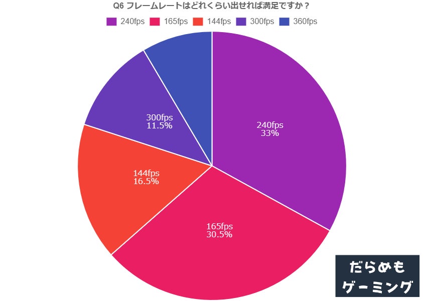 もっとも多くの支持を得たのは「240fps」で33.0%でした。次いで「165fps」が30.5%、「144fps」は16.5%という結果です。