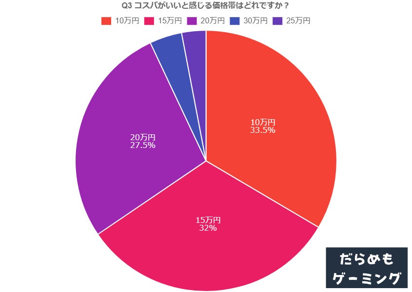 反対に「25万円」や「30万円」に関しては、それぞれ3.0%、4.0%にとどまり、コスパという観点では支持が限られていることが読み取れます。