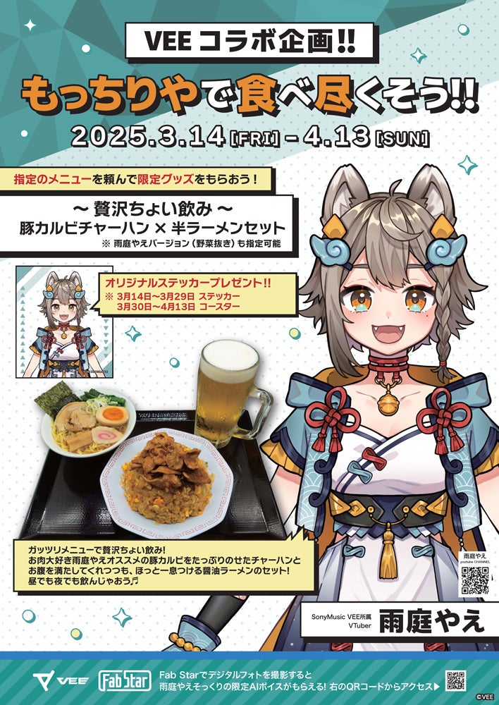 京急ロイヤルフーズ株式会社(本社:東京都・大田区、取締役社長:小島賢二)が運営する町中華「もっちりや」、レストラン「ピースター(ボートレース平和島劇場)」、黒湯天然温泉みうら湯内レストラン「みうら亭」において、ソニー・ミュージックエンタテインメントがVTuberのプロジェクトとして立ち上げたVEE所属「雨庭やえ」、「亞生うぱる」とコラボしたメニューを販売します。