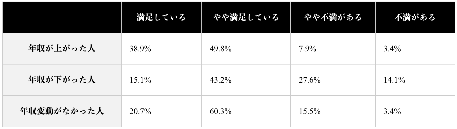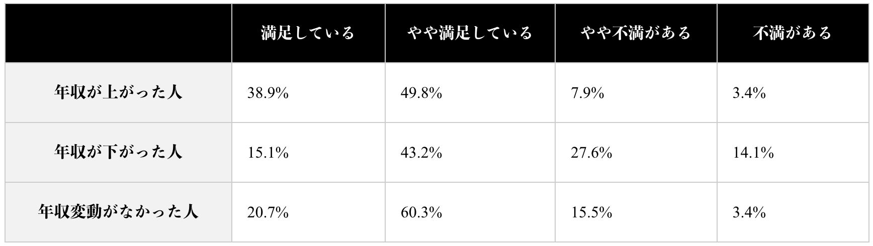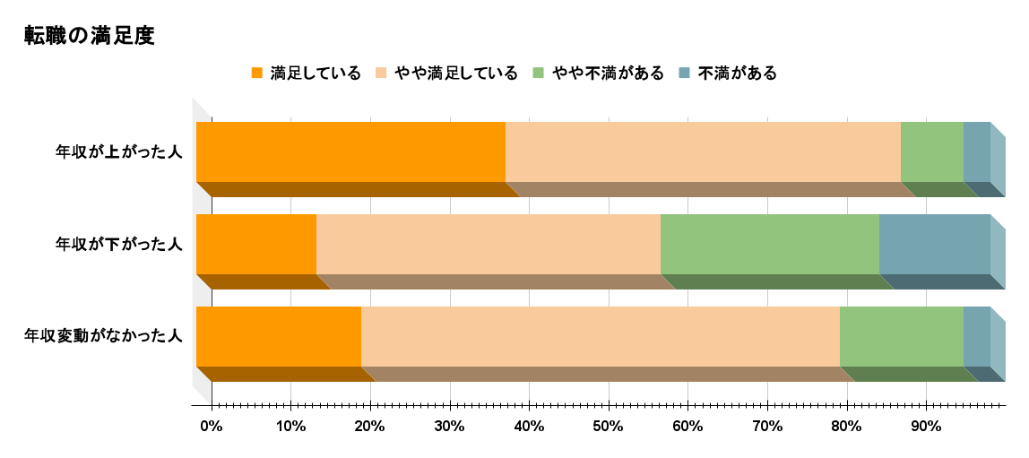 一方で年収が下がった人は転職に満足している割合が減り、約4割が不満を持っていることが分かりました。