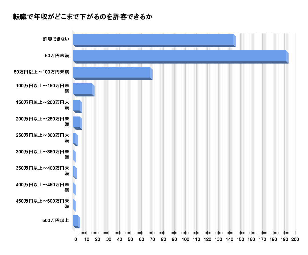 転職で年収がどこまで下がるのを許容できるかを調査したところ、以下の結果となりました。