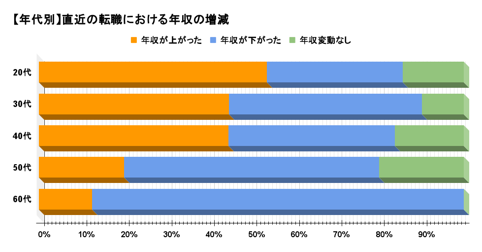 年収が上がった人は20代が最も多く、年代が上がるにつれ年収が下がった人の割合が増えています。若い世代はキャリアを形成している段階であり、年収の伸びしろが多く、年収アップの割合が多いと言えるでしょう。
