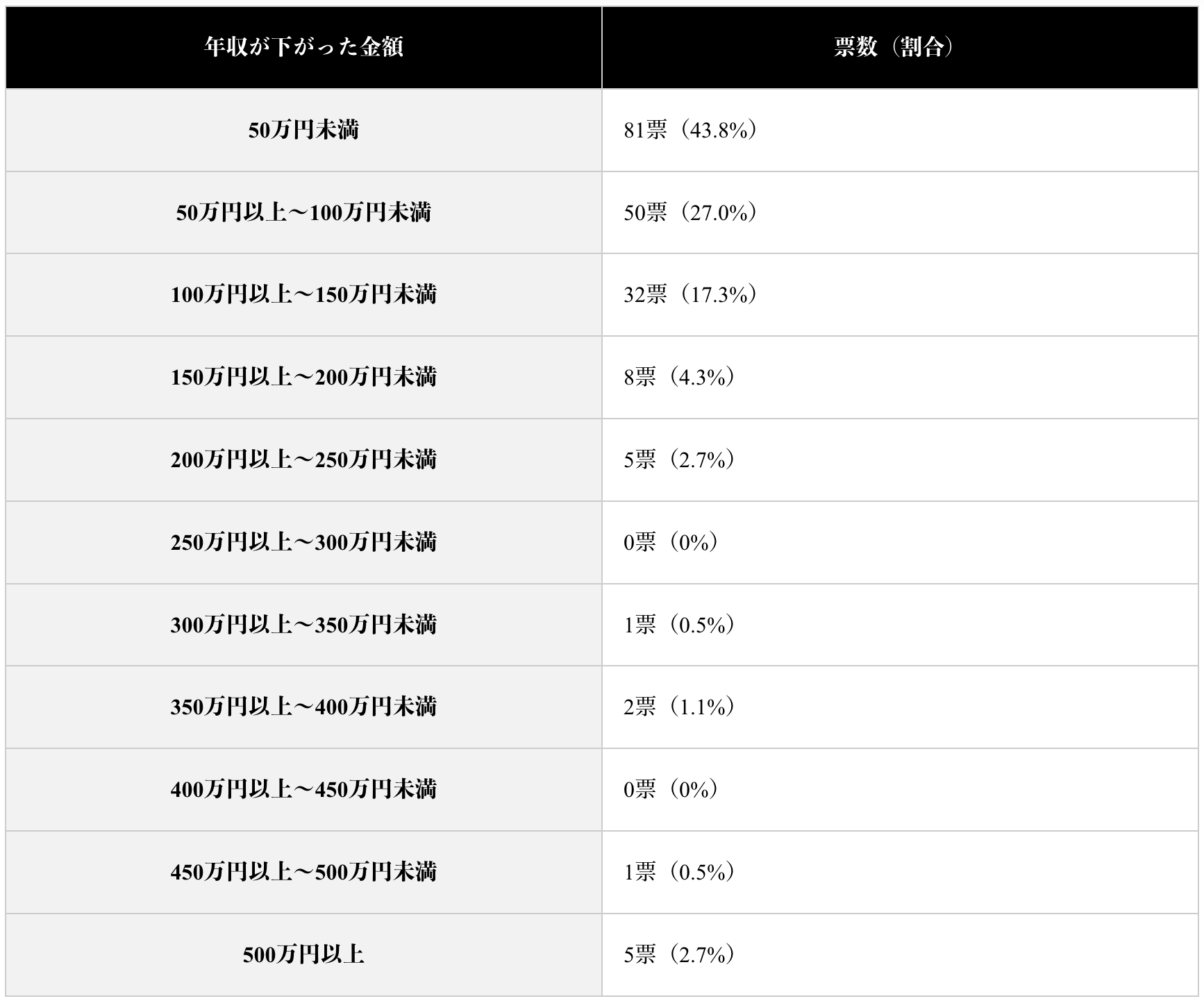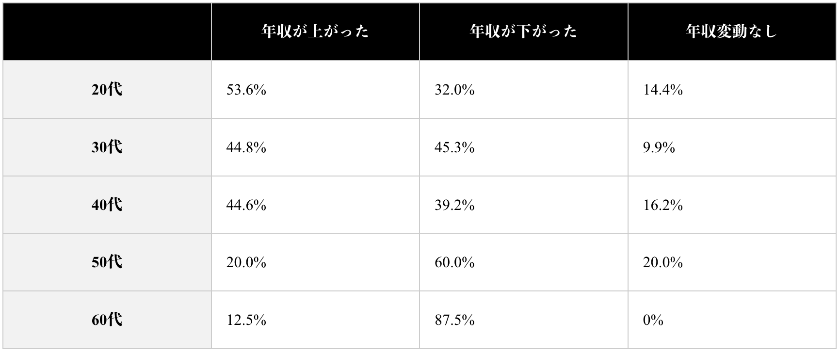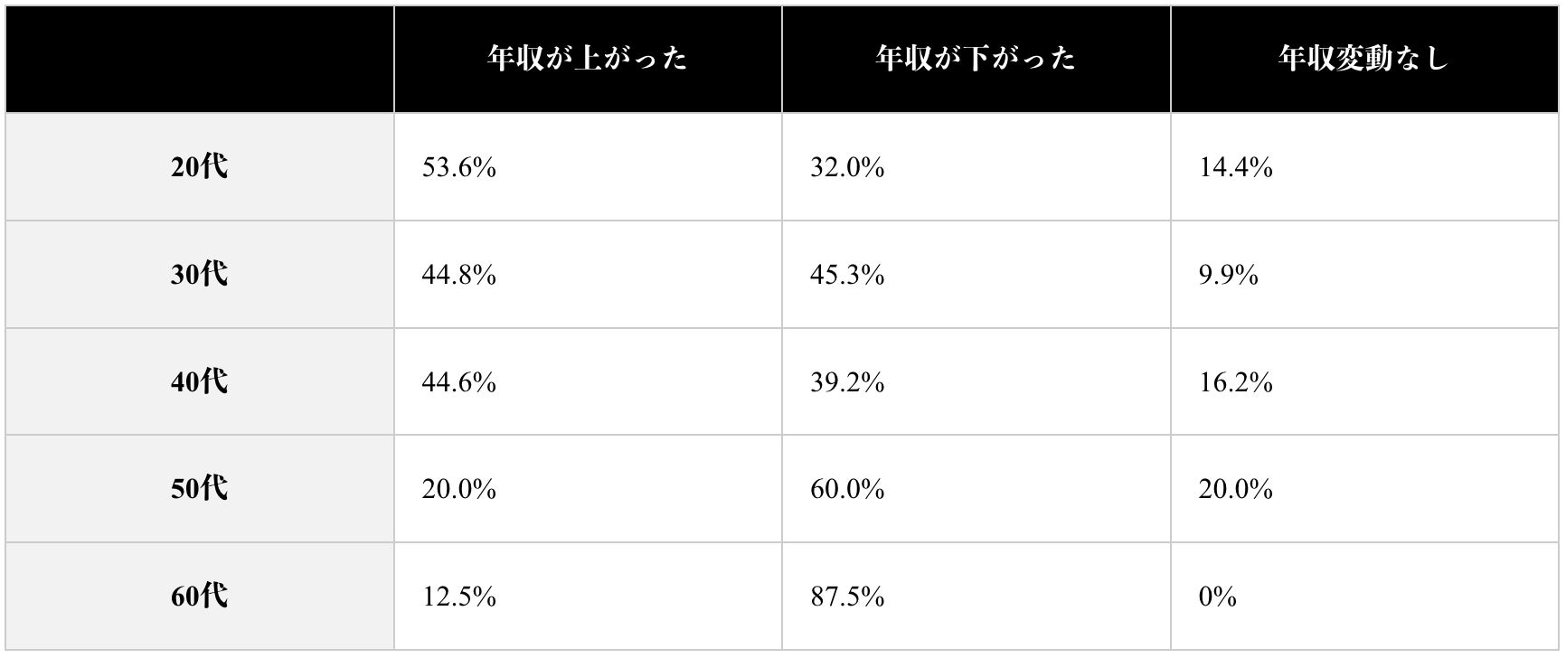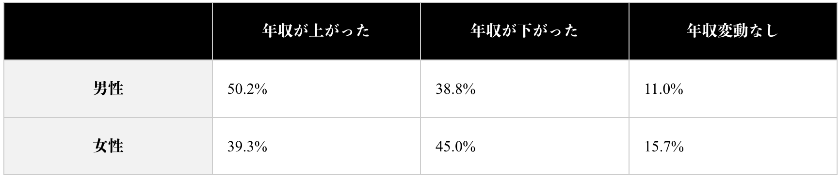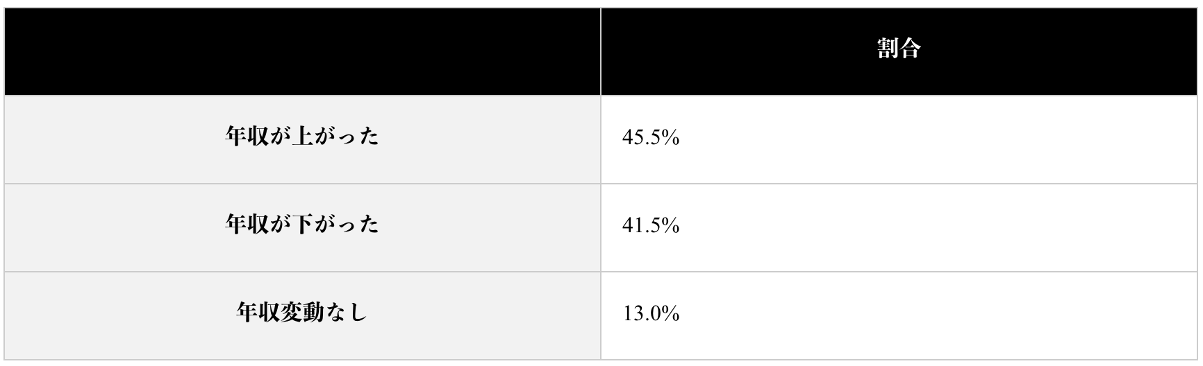 全体の年収変動としては、年収が上がった人と下がった人の割合はどちらも約4割と同程度という結果になりました。