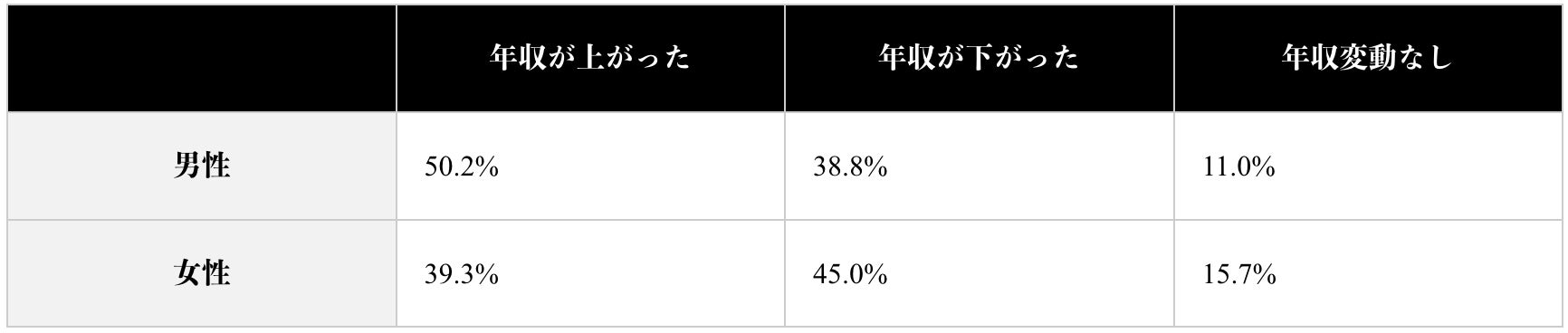 年収が上がった人の割合は男性のほうが多い結果となりました。管理職に就く割合はいまだ男性の方が多いことや、女性は結婚や出産などのライフイベントによる休職やブランク期間が発生しやすいことが要因として考えられます。