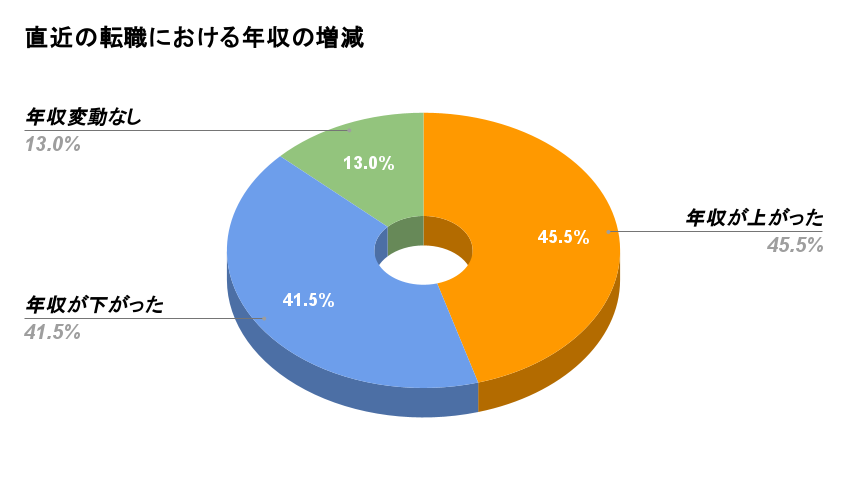 かつての終身雇用の考え方は変わり、近年では転職を考える人が増えていますが、年収が上がった人の割合は全体の45.5%であることから、「転職=年収が上がる」とは言い切れないことが分かります。