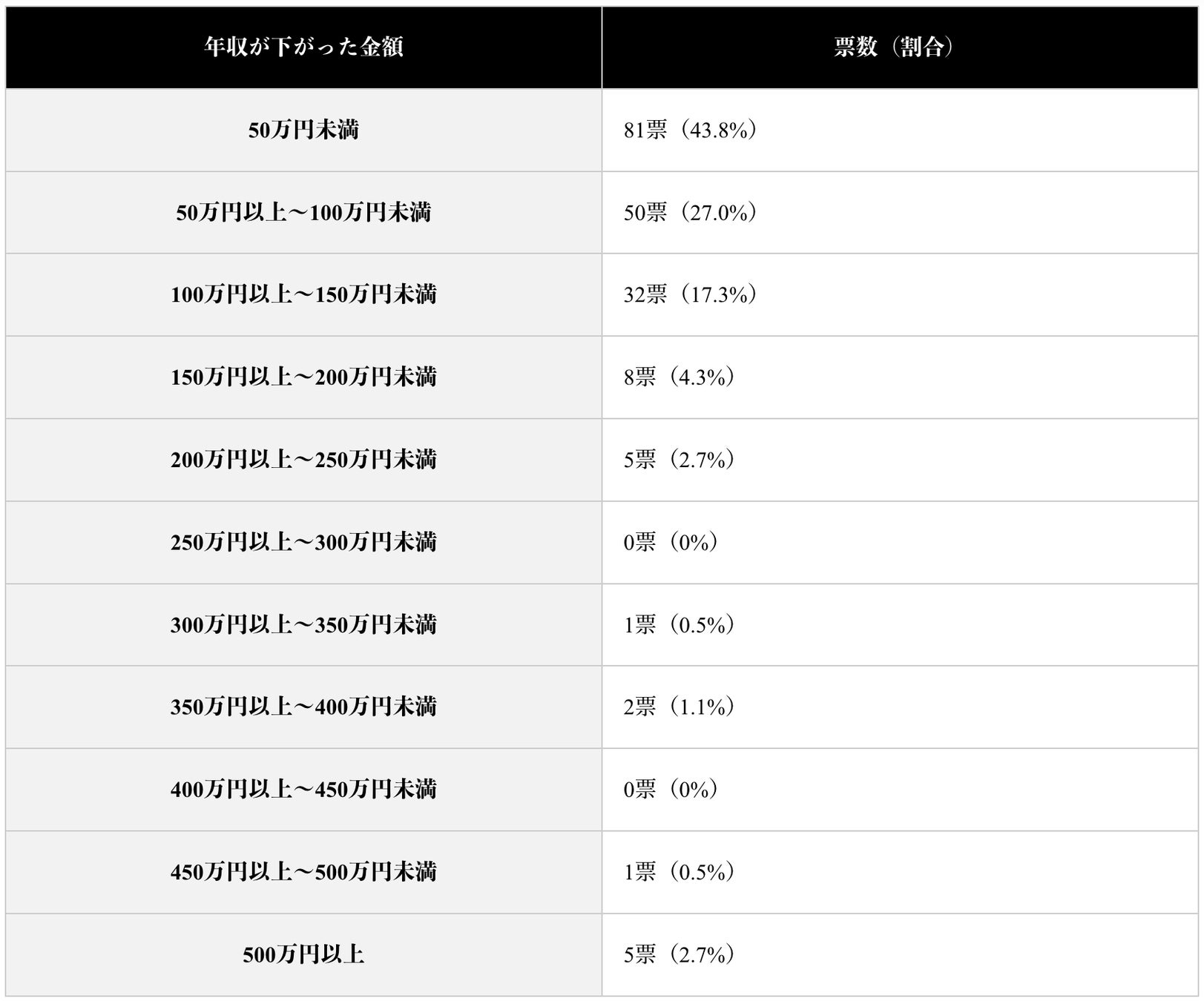 年収が下がった人の年収変動額は100万円未満が全体の7割、100万円~150万円下がる人は約2割