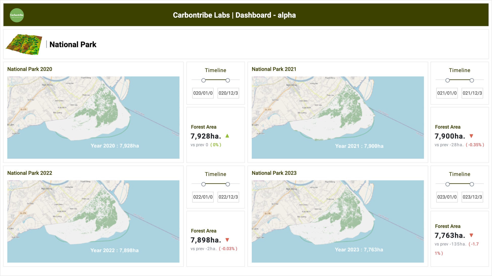 本実証試験では、日本の森林(約16,000ha.)、ベトナムのマングローブ林(約12,000ha.)、インドネシアの熱帯雨林(約50,000ha.)に対して、Google Earth Engineから取得した衛星画像データをCarbontribeの独自モデルを用いて解析しました。AIによる広範囲における森林の複雑な増減変化の追跡や可視化、及びカーボンクレジット生成に必要なパラメーター取得が可能であることが確認できました。