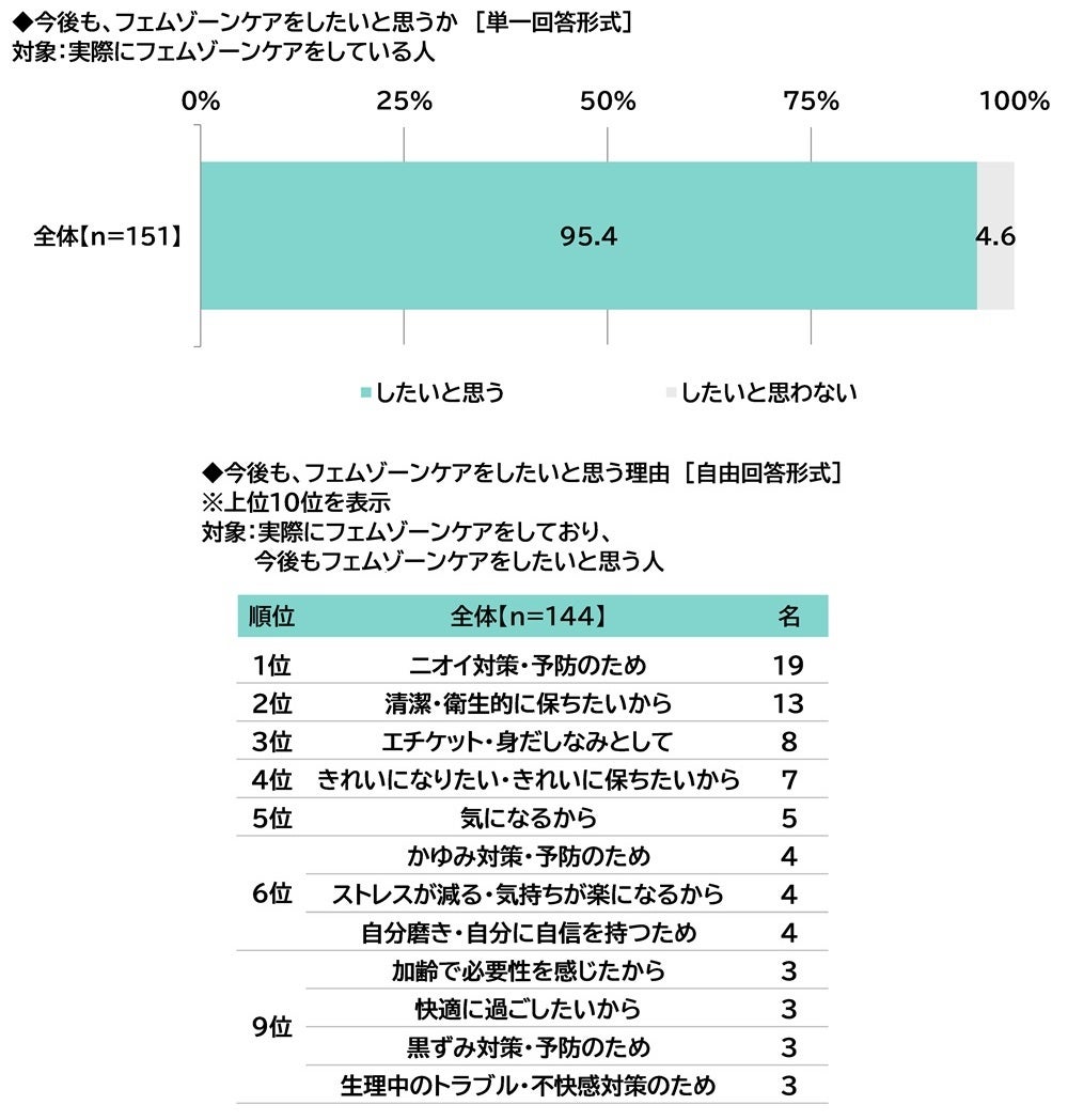今後もフェムゾーンケアをしたいと思う人(144名)に、その理由を聞いたところ、1位「ニオイ対策・予防のため」(19名)、2位「清潔・衛生的に保ちたいから」(13名)、3位「エチケット・身だしなみとして」(8名)、4位「きれいになりたい・きれいに保ちたいから」(7名)、5位「気になるから」(5名)となりました。