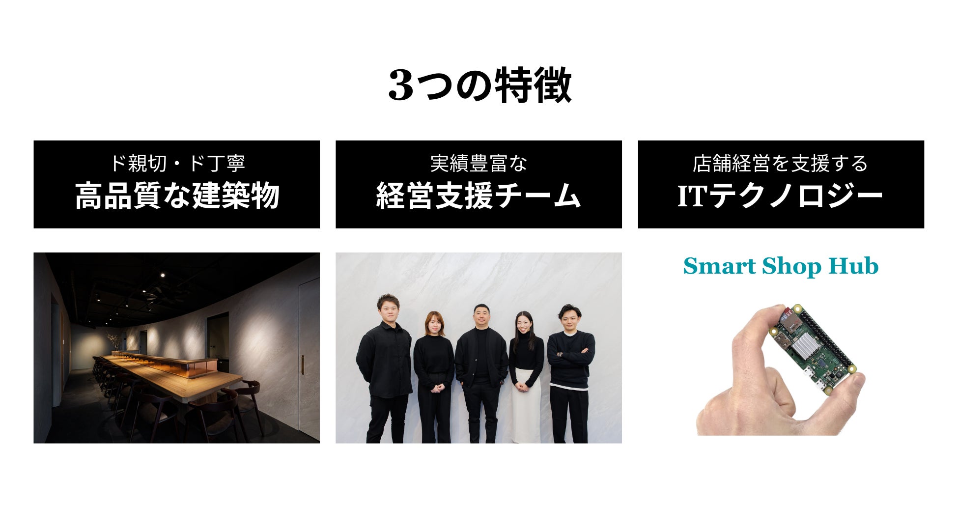 本来であれば別々の窓口に依頼することになる物件探しや店舗の施工、経営支援、そして集客までワンストップでお任せいただけるのが、この「Make a Shop β」です。