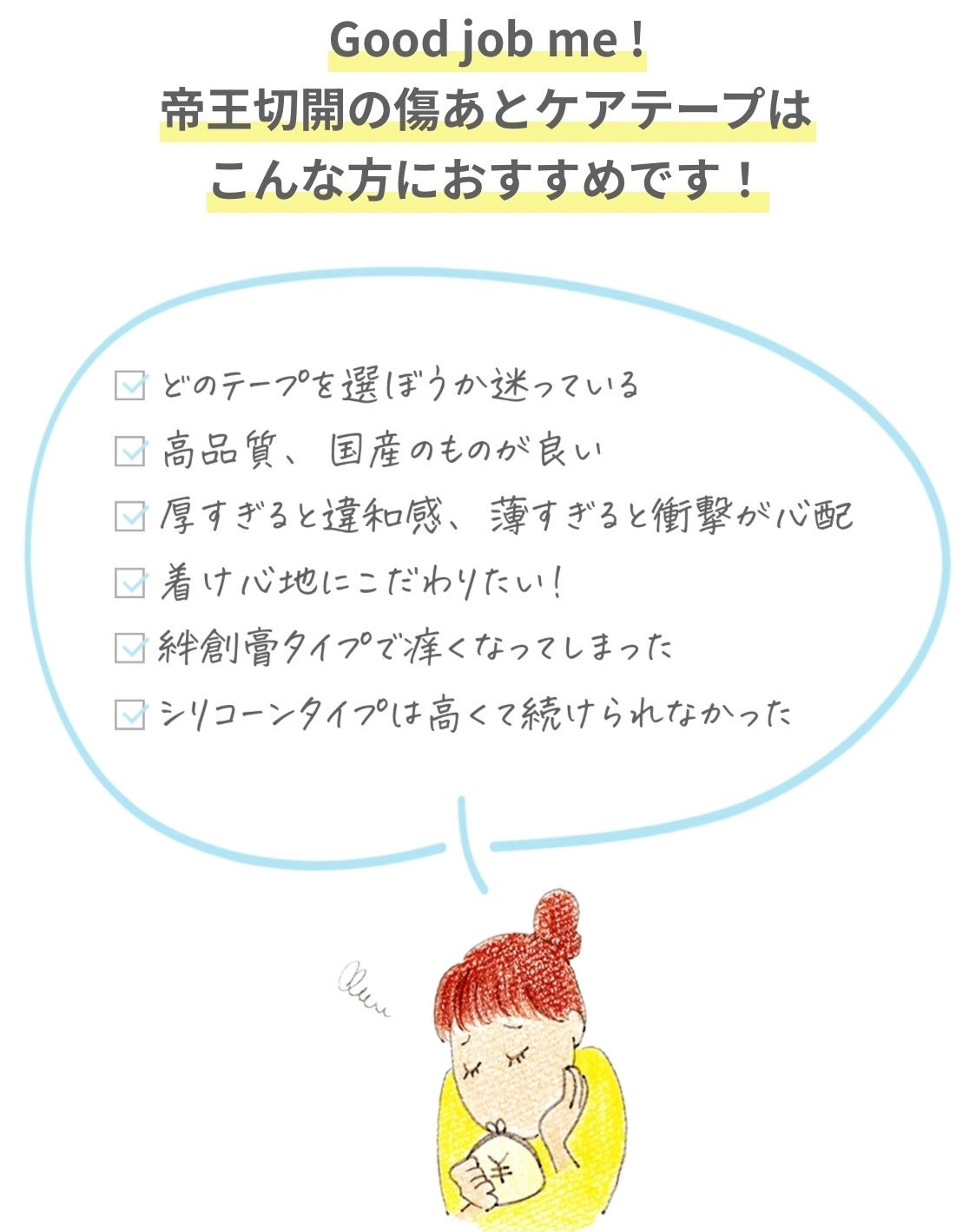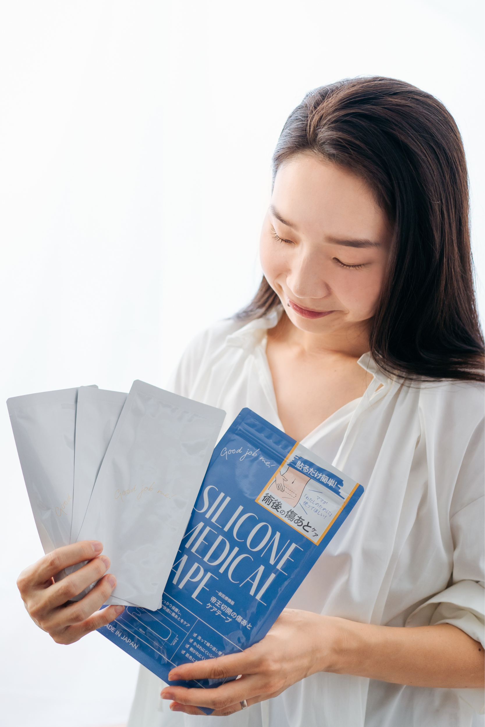 育児中のお母さんは、自分のケアがついつい後回しになってしまいがち。しかしテープを貼っておくだけなら、育児に追われているお母さんでも簡単に傷あとのケアができますよね。帝王切開での出産を頑張ったご自分への労りとしての傷あとケア。Good job me ! はその一助になってくれると思います。